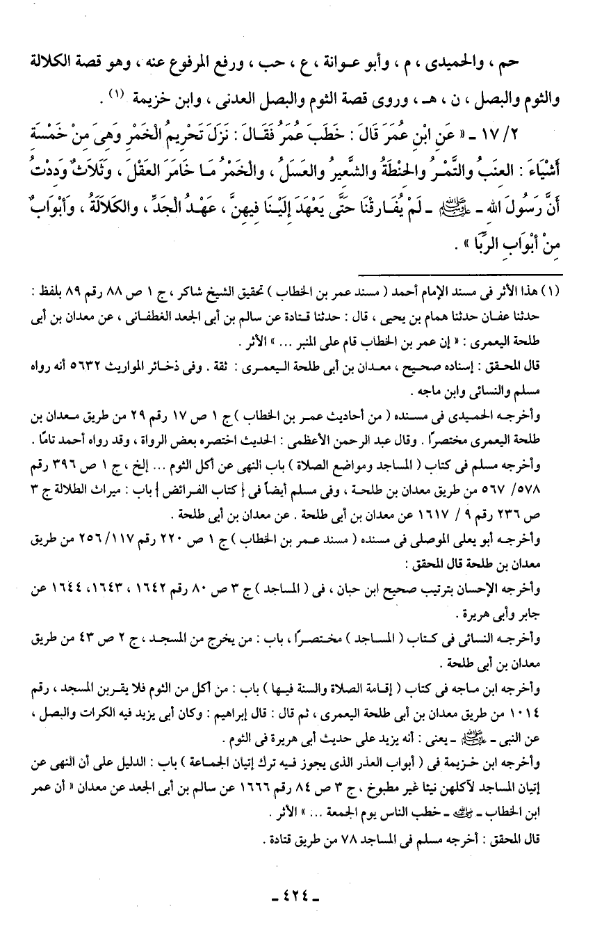 وأخرجه الحميدى في مسنده (من أحاديث عمر بن الخطاب) ج 1 ص 17 رقم 29 من طريق معدان بن طلحة اليعمرى مختصرًا. وقال عبد الرحمن الأعظمى: الحديث اختصره بعض الرواة، وقد رواه أحمد تامًا. وأخرجه مسلم في كتاب (المساجد ومواضع الصلاة) باب النهى عن أكل الثوم ... إلخ، ج 1 ص 396 رقم 578/ 567 من طريق معدان بن طلحة، وفى مسلم أيضًا في [كتاب الفرائض] باب: ميراث الطلالة ج 3 ص 236 رقم 9/ 1617 عن معدان بن أبى طلحة. عن معدان بن أبى طلحة.