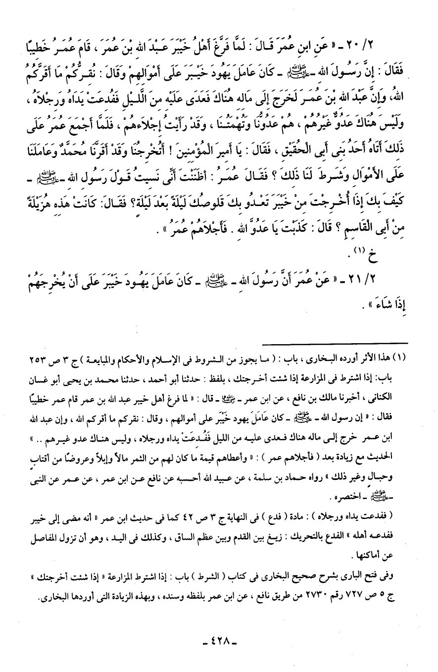 2/ 21 - "عَنْ عُمَرَ أَنَّ رَسُولَ اللهِ - صلى الله عليه وسلم - كَانَ عَامَلَ يَهُودَ خَيْبَرَ عَلَى أَنْ يُخْرِجَهُمْ إِذَا شَاءَ".