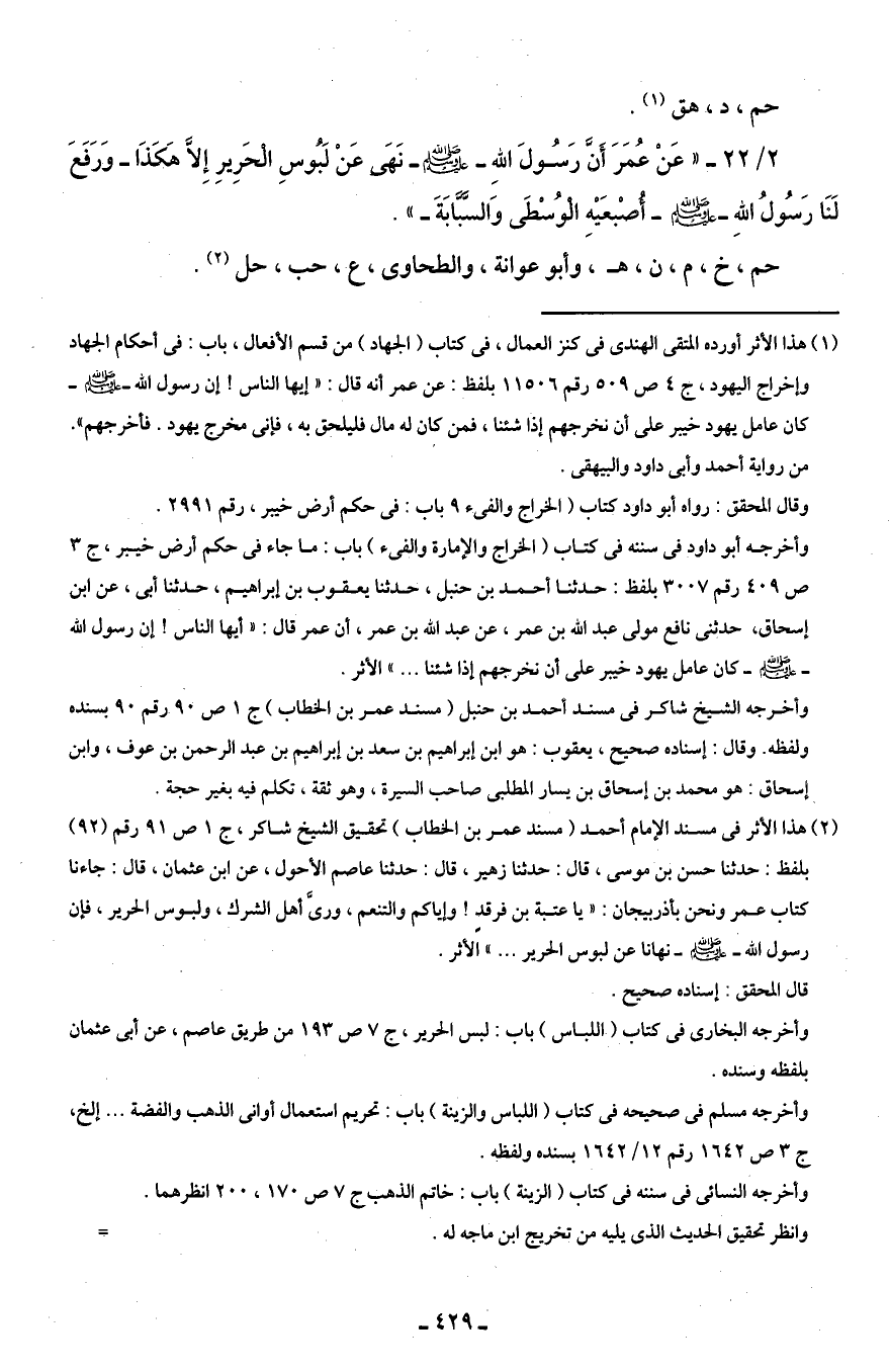 (¬2) هذا الأثر في مسند الإمام أحمد (مسند عمر بن الخطاب) تحقيق الشيخ شاكر، ج 1 ص 91 رقم (92) بلفظ: حدثنا حسن بن موسى، قال: حدثنا زهير، قال: حدثنا عاصم الأحول، عن ابن عثمان، قال: جاءنا كتاب عمر ونحن بأذربيجان: "يا عتبة بن فرقدٍ! وإياكم والتنعم، ورىَّ أهل الشرك، ولبوس الحرير، فإن رسول الله - صلى الله عليه وسلم - نهانا عن لبوس الحرير ... " الأثر.