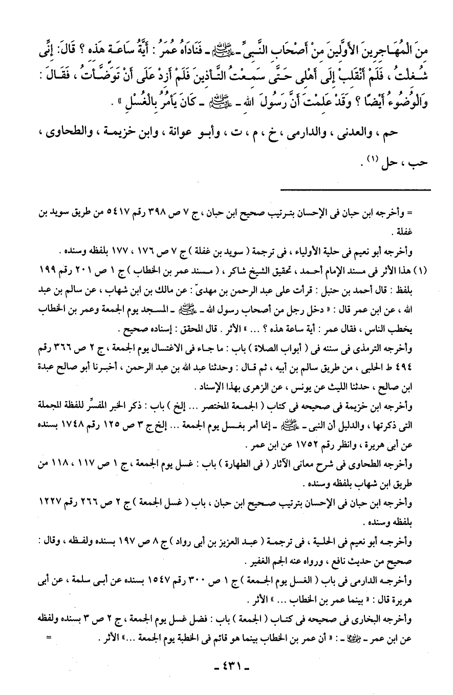 مِنَ الْمُهَاجِرِينَ الأَوَّلِينَ مِنْ أَصْحَابِ النَّبِىِّ - صلى الله عليه وسلم - فَنَادَاهُ عُمَرُ: أَيَّةُ سَاعَةٍ هَذِهِ؟ قَالَ: إِنِّى شُغِلْتُ، فَلَمْ أَنْقَلِبْ إِلَى أَهْلِى حَتَّى سَمِعْتُ التَّأذِينَ فَلَمْ أَزِدْ عَلَى أَنْ تَوَضَّأَتُ، فَقَالَ: وَالْوُضُوءُ أَيْضًا؟ وَقَدْ عَلِمْتَ أَنَّ رَسُولَ اللهِ - صلى الله عليه وسلم - كَانَ يَأمُرُ بِالْغُسْلِ".
