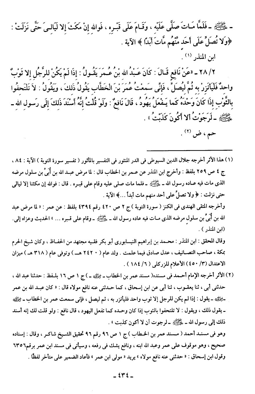 (¬1) هذا الأثر أخرجه جلال الدين السيوطي في الدر المنثور في التفسير بالمأثور (تفسير سورة التوبة) الآية: 84، ج 4 ص 259 بلفظ: وأخرج ابن المنذر عن عمر بن الخطاب قال: لما مرض عبد الله بن أُبَيِّ بن سلول مرضه الذي مات فيه عاده رسول الله - صلى الله عليه وسلم - فلما مات صلى عليه وقام على قبره. قال: فوالله إن مكثنا إلا ليالى حتى نزلت: {وَلَا تُصَلِّ عَلَى أَحَدٍ مِنْهُمْ مَاتَ أَبَدًا ... } الآية.