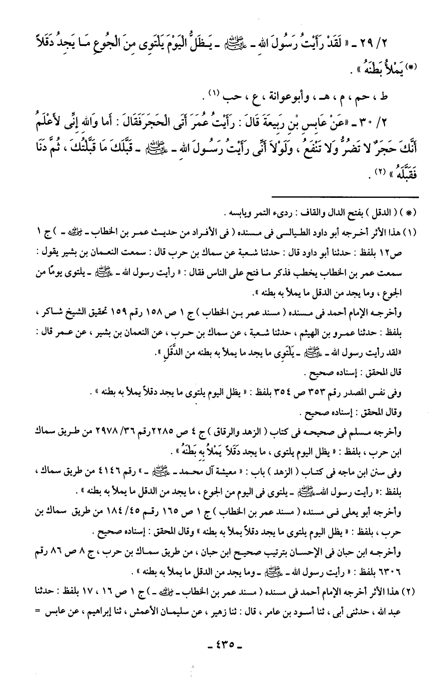 2/ 29 - "لَقَدْ رَأَيْتُ رَسُولَ اللهِ - صلى الله عليه وسلم - يَظَلُّ الْيَوْمَ يَلْتَوِى مِنَ الْجُوعِ مَا يَجِدُ دَقَلًا (*) يَمْلأُ بَطْنَهُ".