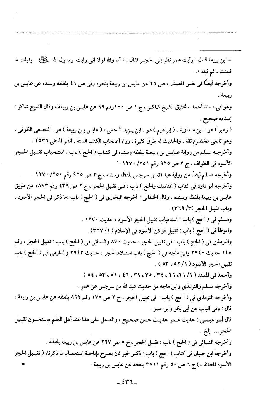 = ابن ربيعة قال: رأيت عمر نظر إلى الحجر فقال: "أما والله لولا أنى رأيت رسول الله - صلى الله عليه وسلم - يقبلك ما قبلتك، ثم قبله".