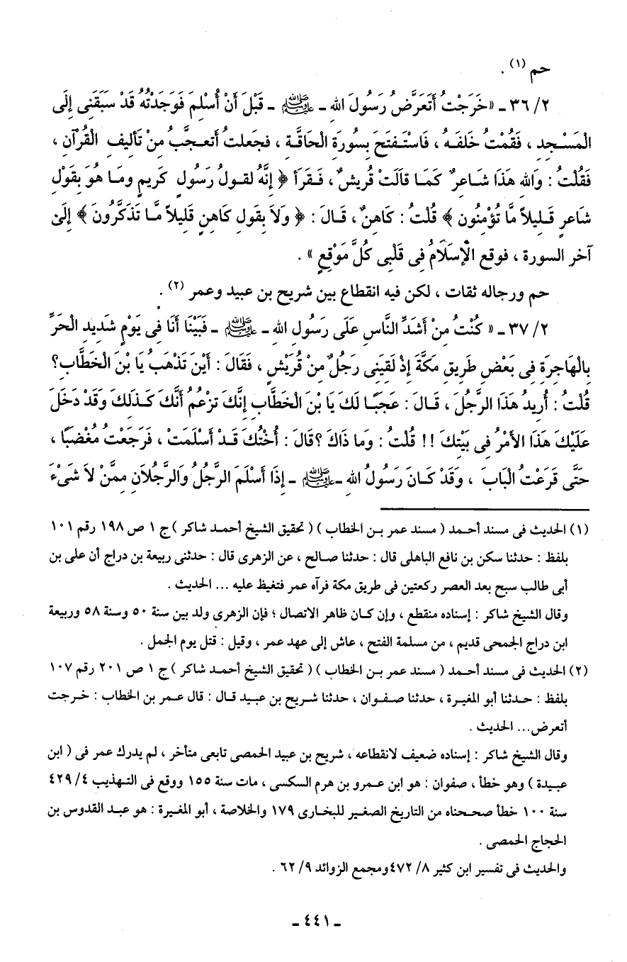 (¬2) الحديث في مسند أحمد (مسند عمر بن الخطاب) (تحقيق الشيخ أحمد شاكر) ج 1 ص 201 رقم 107 بلفظ: حدثنا أبو المغيرة، حدثنا صفوان، حدثنا شريح بن عبيد قال: قال عمر بن الخطاب: خرجت أتعرض ... الحديث.