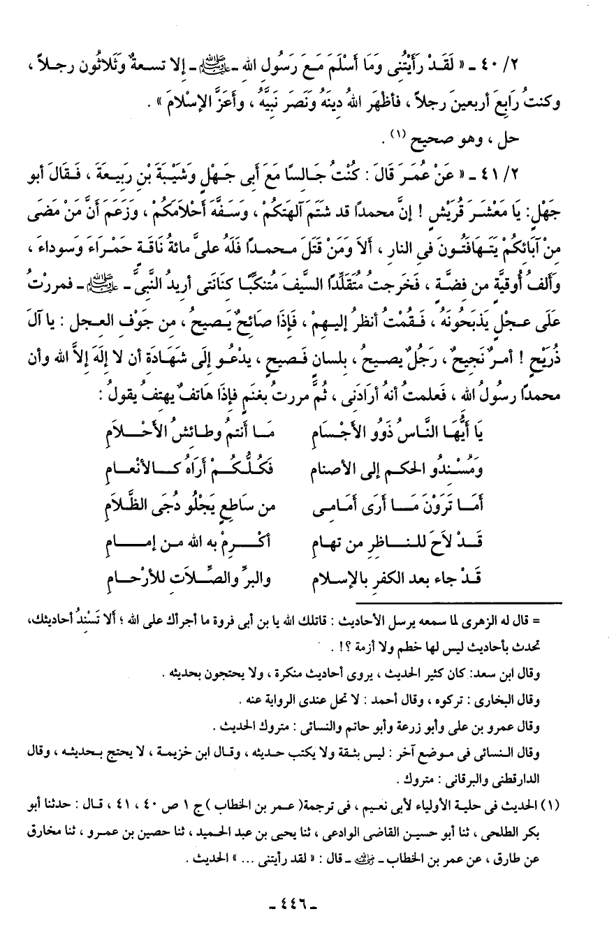 2/ 41 - "عَنْ عُمَرَ قَالَ: كُنْتُ جَالِسًا مَعَ أَبِى جَهْلٍ وَشَيْبَةَ بْنِ رَبِيعَةَ، فَقَالَ أبو جَهْلٍ: يَا مَعْشَرَ قُرَيْشٍ! إنَّ محمدًا قد شَتَمَ آلهَتكُمْ، وَسَفَّهَ أَحْلَامَكُمْ، وَزَعَمَ أَنَّ مَنْ مَضَى مِنْ آبَائِكُمْ يَتَهَافَتُونَ فيِ النارِ، أَلَا وَمَنْ قَتَلَ محمدًا فَلَهُ علىَّ مائةُ نَاقَةٍ حَمْرَاءَ وَسوداءَ، وَأَلفُ أُوقيَّةٍ من فِضَّةٍ، فَخَرجتُ مُتَقَلِّدًا السَّيفَ مُتنكِّبًا كِنَانَتى أرِيدُ النَّبِىَّ - صلى الله عليه وسلم - فمررْتُ عَلَى عجْلٍ يَذبَحُونَهُ، فَقُمْتُ أنظرُ إليهِمْ، فَإِذَا صَائِحٌ يَصيحُ، مِن جَوْفِ العِجل: يا آلَ ذُرَيْحٍ! أمرٌ نَجِيحٌ، رَجُلٌ يصيحُ، بِلسانٍ فَصيحٍ، يدْعُو إِلَى شَهَادَةِ أن لا إِلَهَ إِلَّا الله وأن محمدًا رسُولُ اللهِ، فَعلمتُ أنهُ أرَادَنِي، ثُمَّ مررتُ بغنَمٍ فإِذَا هَاتفٌ يهتِفُ يقولُ: