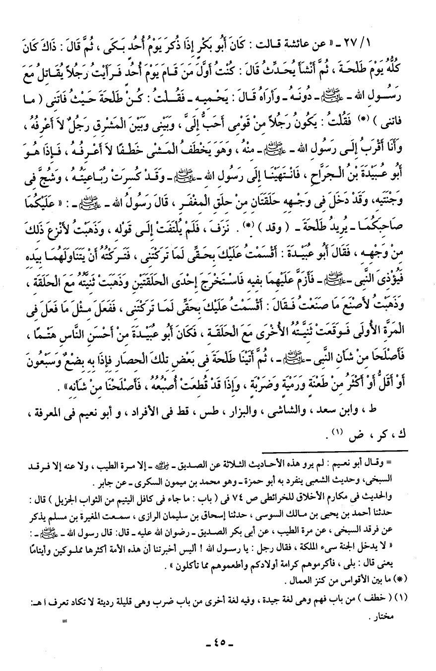 1/ 27 - "عن عائشة قالت: كَانَ أَبُو بَكْرٍ إِذَا ذُكرَ يَوْمُ أُحُدٍ بَكَى، ثُمَّ قَالَ: ذَاكَ كَانَ كُلُّهُ يَوْمَ طَلْحَةَ، ثُمَّ أَنْشَأَ يُحَدِّثُ قَالَ: كُنْتُ أَوَّلَ مَنَ قَامَ يَوْمَ أُحُدٍ فَرَأَيْتُ رَجُلًا يُقَاتِلُ مَعَ رَسُولِ الله - صلى الله عليه وسلم - دُونَهُ - وَأرَاهُ قَالَ: يَحْمِيهِ - فَقُلْتُ: كُنْ طَلْحَةَ حَيْثُ فَاتَنِى (ما فاتنى) (*) فَقُلْتُ: يَكُونُ رَجُلًا مِنْ قَوْمِى أَحَبُّ إِلَىَّ، وَبَيْنِى وَبَيْنَ الْمَشْرِقِ رَجُلٌ لَا أَعْرِفُهُ، وَأَنَا أَقْرَبُ إِلَى رَسُولِ الله - صلى الله عليه وسلم - مِنْهُ، وَهَوَ يَخْطَفُ الْمَشْى خَطْفًا لاَ أَعْرِفُهُ، فَإِذَا هُوَ أَبُو عُبَيْدَةَ بْنُ الْجَرَّاحِ، فَانْتَهَيْنَا إِلَى رَسُولِ اللهِ - صلى الله عليه وسلم - وَقَدْ كُسِرَتْ رُبَاعِيَتُهُ، وَشُجَّ فِى وَجْنَتَيهِ، وَقَدْ دَخَلَ فِى وَجْهِهِ حَلَقَتَانِ مِنْ حِلَقِ الْمِغْفَرِ، قَالَ رَسُولُ الله - صلى الله عليه وسلم -: "عَلَيْكُمَا صَاحِبَكُمَا - يُرِيدُ طَلْحَةَ - (وقد) (*). نَزَفَ، فَلَمْ يُلْتَفَتْ إِلَى قَوْلِهِ، وَذَهَبْتُ لأَنْزعَ ذَلِكَ مِنْ وَجْهِهِ، فَقَالَ أَبُو عُبَيْدَةَ: أَقْسَمْتُ عَلَيْكَ بِحَقِّى لَمَا تَرَكْتَنِى، فَتَرَكْتُهُ أَنْ يَتَنَاوَلَهُمَا بِيَدِهِ فَيُؤْذِىَ النَّبِى - صلى الله عليه وسلم - فَأَزَمَّ عَلَيْهِمَا بفِيهِ فَاسْتَخْرَجَ إِحْدَى الْحَلَقَتَيْنِ وَذَهَبَتْ ثَنِيَّتُهُ مَعَ الْحَلَقَةِ، وَذَهَبْتُ لأَصْنَعَ مَا صَنَعْتُ فَقَالَ: أَقْسَمْتُ عَلَيْكَ بحَقِّى لَمَا تَرَكْتَنِى، فَفَعَلَ مِثْلَ مَا فَعَلَ فِى الْمَرَّةِ الأُولَى فَوَقَعَتْ ثَنِيَّتُهُ الأُخْرَى مَعَ الْحَلَقَةِ، فَكَانَ أَبُو عُبَيْدَةَ مِنْ أَحْسَنِ النَّاسِ هَتْمًا، فَأَصْلَحَا مِنْ شَأنِ النَّبِى - صلى الله عليه وسلم -، ثُمَّ أَتَيْنَا طَلْحَةَ فِى بَعْضِ تِلْكَ الْحِصَارِ فَإِذَا بِهِ بِضْعٌ وَسَبْعُونَ أَوْ أَقَلُّ أَوْ أَكْثَرُ مِنْ طَعْنَةٍ وَرَمْيَةٍ وَضَرْبَةٍ، وَإِذَا قَدْ قُطِعَتْ أُصْبُعُهُ، فَأَصْلَحْنَا مِنْ شَأنِهِ".