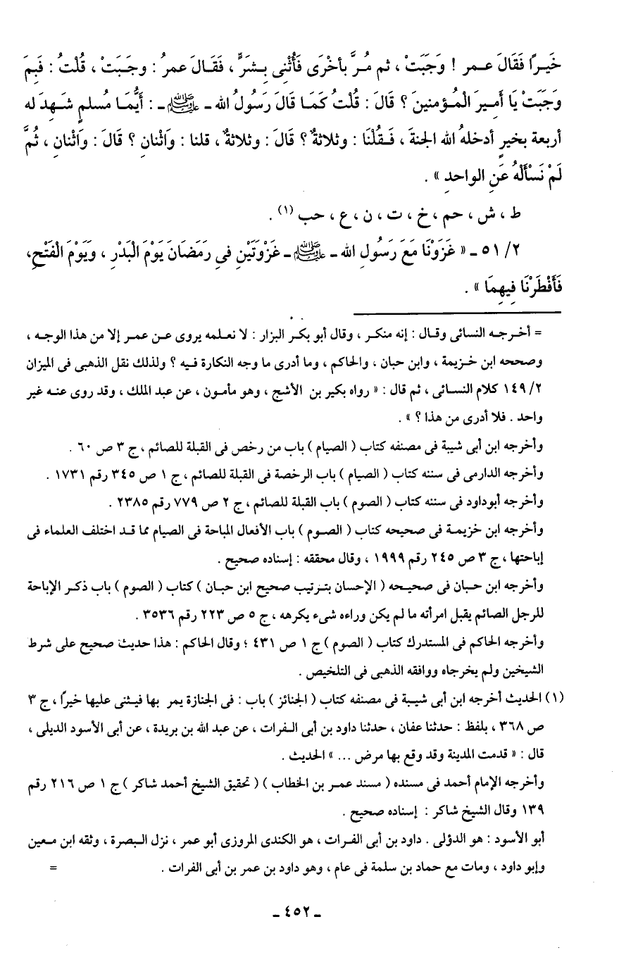 2/ 51 - "غَزَوْنَا مَعَ رَسُولِ الله - صلى الله عليه وسلم - غَزْوَتَيْنِ فيِ رَمَضَانَ يَوْمَ الْبَدْرِ، وَيَوْمَ الْفَتْحِ، فَأَفْطَرْنَا فِيهِمَا".