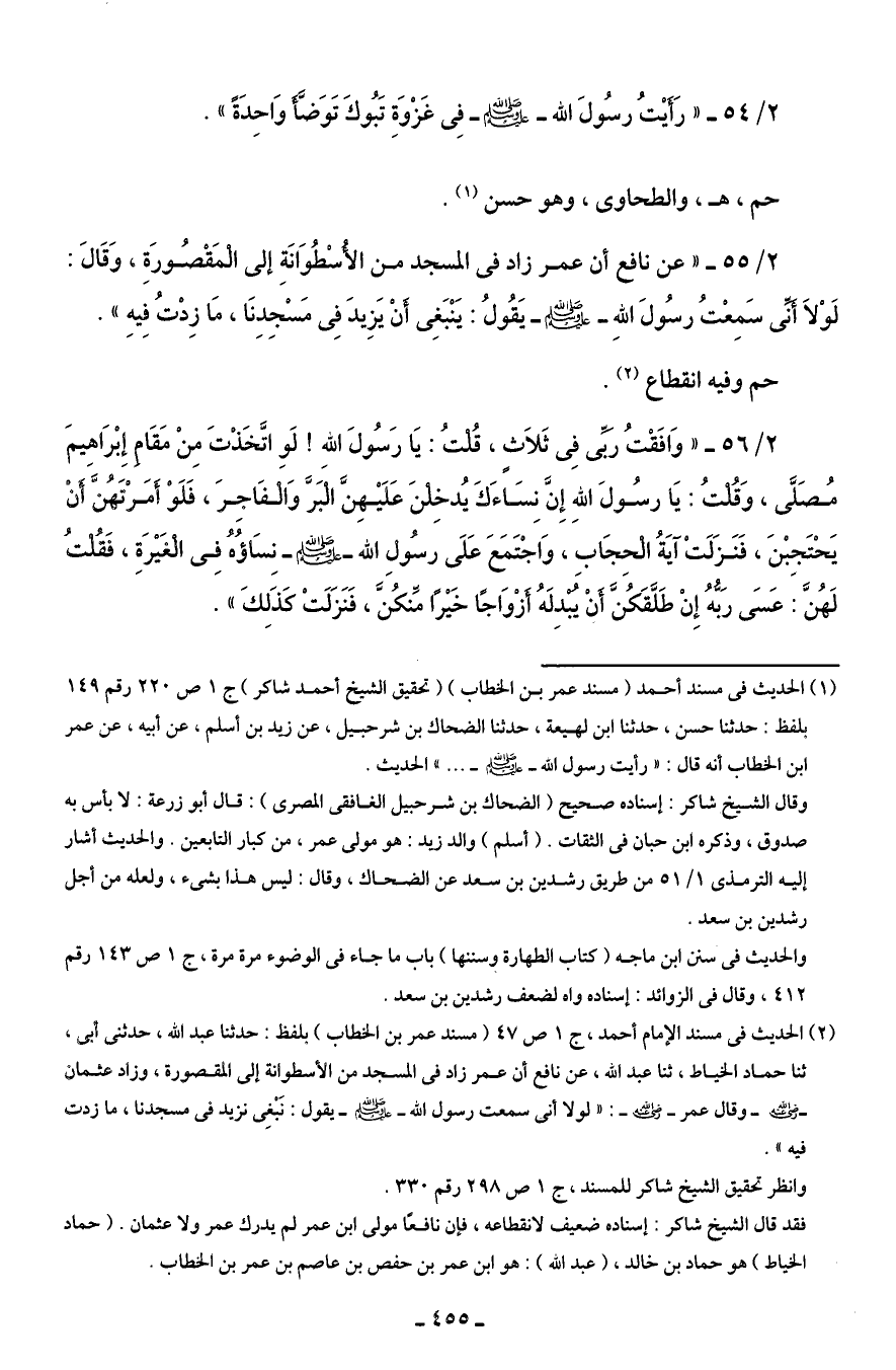 (¬1) الحديث في مسند أحمد (مسند عمر بن الخطاب) (تحقيق الشيخ أحمد شاكر) ج 1 ص 220 رقم 149 بلفظ: حدثنا حسن، حدثنا ابن لهيعة، حدثنا الضحاك بن شرحبيل، عن زيد بن أسلم، عن أبيه، عن عمر بن الخطاب أنه قال: "رأيت رسول الله - صلى الله عليه وسلم - ... " الحديث.