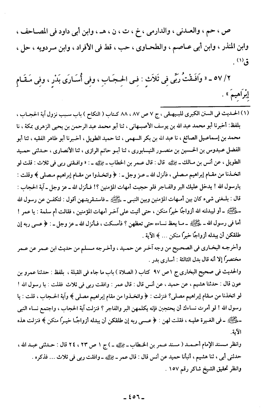 2/ 57 - "وَافَقْتُ ربِّي فِي ثَلَاثٍ: فِي الحِجَابِ، وفِي أُسَارَى بَدْرٍ، وفِي مَقَامِ إِبْرَاهِيمَ".