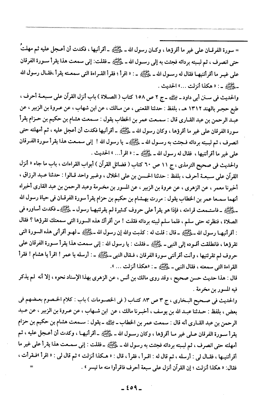 والحديث في صحيح الترمذي، ج 11 ص 60 كتاب (فضائل القرآن) أبواب القراءات، باب ما جاء "أنزل القرآن على سبعة أحرف، بلفظ: حدثنا الحسن بن علي الخلال، وغير واحد قالوا: حدثنا عبد الرزاق، أخبرنا معمر، عن الزهري، عن عروة بن الزبير، عن المسور بن مخرمة وعبد الرحمن بن عبد القاري أخبراه أنهما سمعا عمر بن الخطاب يقول: مررت بهشام بن حكيم بن حزام يقرأ سورة الفرقان في حياة رسول الله - صلى الله عليه وسلم - فاستمعت قراءته، فإذا هو يقرأ على حروف كثيرة لم يقرئنيها رسول - صلى الله عليه وسلم - فكدت أساوره في الصلاة، فنظرته حتى سلم، فلما سلم لببته بردائه فقلت! من أقرأك هذه السورة التى سمعتك تقرؤها؟ فقال: أقرأنيها رسول الله - صلى الله عليه وسلم - قال: قلت له: كذبت والله إن رسول الله - صلى الله عليه وسلم - لهو أقرأني هذه السورة التي تقرؤها، فانطلقت أقوده إلى النبي - صلى الله عليه وسلم - فقلت: يا رسول الله: إني سمعت هذا يقرأ سورة الفرقان على حروف لم تقرئنيها، وأنت أقرأتني سورة الفرقان، فقال النبي - صلى الله عليه وسلم -: أرسله يا عمر! اقرأ يا هشام! فقرأ القراءة التي سمعته، فقال النبي - صلى الله عليه وسلم -: "هكذا أنزلت ... ".