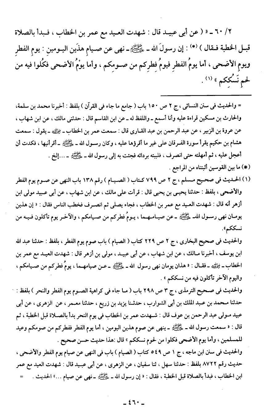 2/ 60 - " (عن أبي عبيد قال: شهدت العيد مع عمر بن الخطاب، فبدأ بالصلاة قبل الخطبة فقال) (*): إن رسولَ الله - صلى الله عليه وسلم - نهى عن صيامِ هذَين اليومينِ: يومِ الفطرِ ويومِ الأضحى، أما يومُ الفطرِ فيومُ فِطرِكم من صومِكم، وأما يوْمُ الأضحى فكُلوا فيه من لحمِ نَسُكِكم" (¬1).