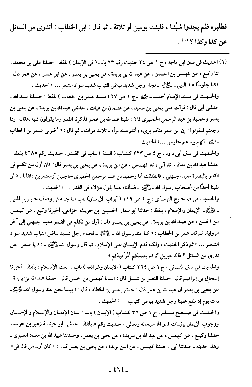 (¬1) الحديث في سنن ابن ماجه، ج 1 ص 24 حديث رقم 63 باب (في الإيمان) بلفظ: حدثنا على بن محمد، ثنا وكيع، عن كهمس بن الحسن، عن عبد الله بن بريدة، عن يحيى بن يعمر، عن ابن عمر، عن عمر قال: "كنا جلوسًا عند النبي - صلى الله عليه وسلم - فجاء رجل شديد بياض الثياب شديد سواد الشعر ... " الحديث.