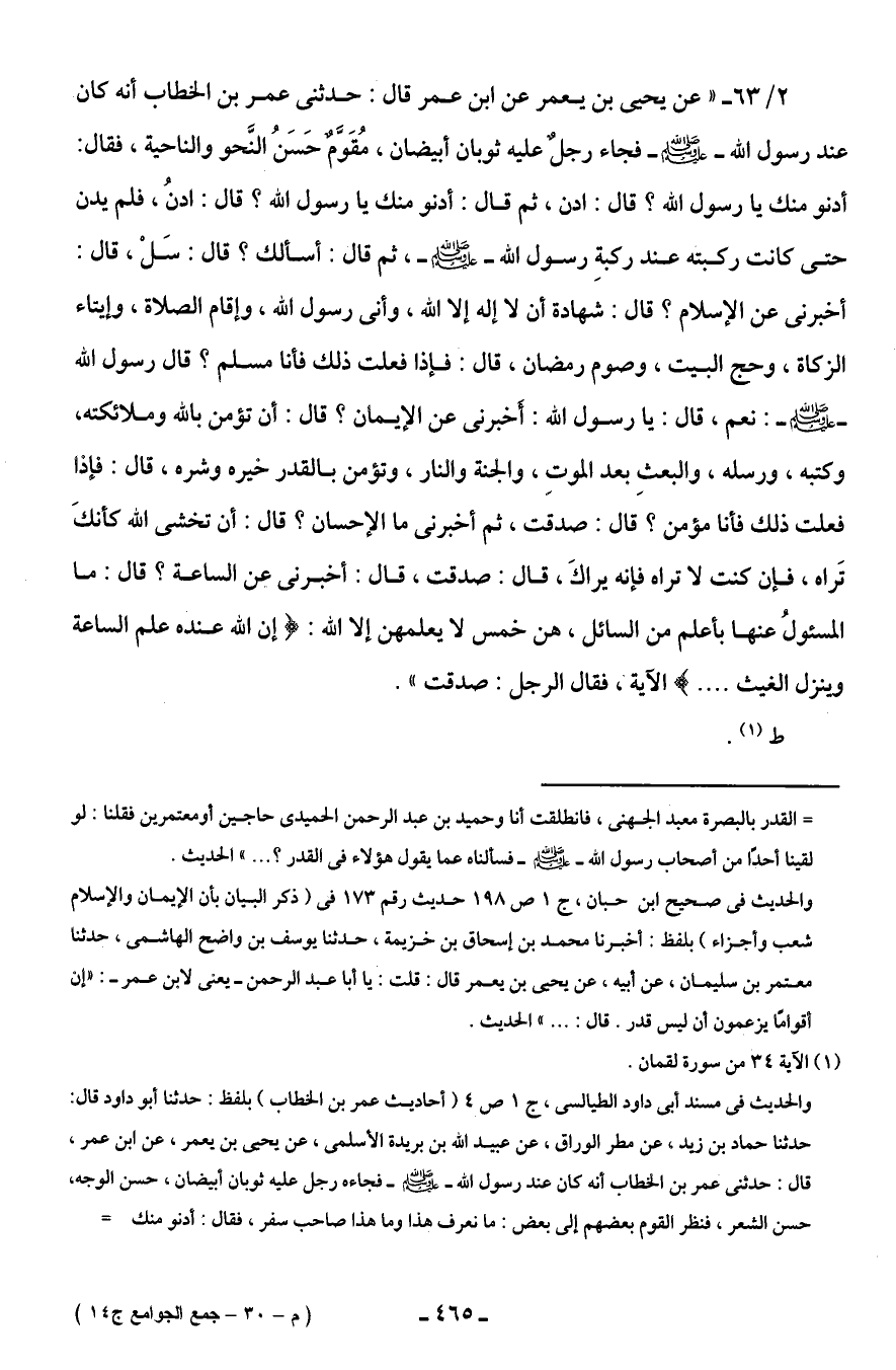 2/ 63 - "عن يحيى بن يعمر عن ابن عمر قال: حدثني عمر بن الخطاب أنه كان عند رسول الله - صلى الله عليه وسلم - فجاء رجلٌ عليه ثوبان أبيضان، مُقَوَّمٌ حَسَنُ النَّحو والناحية، فقال: أدنو منك يا رسول الله؟ قال: ادن، ثم قال: أدنو منك يا رسول الله؟ قال: ادنُ، فلم يدن حتى كانت ركبته عند ركبةِ رسول الله - صلى الله عليه وسلم -، ثم قال: أسألك؟ قال: سَلْ، قال: أخبرني عن الإسلام؟ قال: شهادة أن لا إله إلا الله، وأني رسول الله، وإقام الصلاة، وإيتاء الزكاة، وحج البيت، وصوم رمضان، قال: فإذا فعلت ذلك فأنا مسلم؟ قال رسول الله - صلى الله عليه وسلم -: نعم، قال: يا رسول الله: أَخبرني عن الإيمان؟ قال: أن تؤمن بالله وملائكته، وكتبه، ورسله، والبعثِ بعد الموتِ، والجنة والنار، وتؤمن بالقدر خيره وشره، قال: فإذا فعلت ذلك فأنا مؤمن؟ قال: صدقت، ثم أخبرني ما الإحسان؟ قال: أن تخشى الله كأنكَ تَراه، فإن كنت لا تراه فإنه يراكَ، قال: صدقت، قال: أخبرني عن الساعة؟ قال: ما المسئولُ عنها بأعلم من السائل، هن خمس لا يعلمهن إلا الله: {إِنَّ اللَّهَ عِنْدَهُ عِلْمُ السَّاعَةِ وَيُنَزِّلُ الْغَيْثَ ... } الآية، فقال الرجل: صدقت".