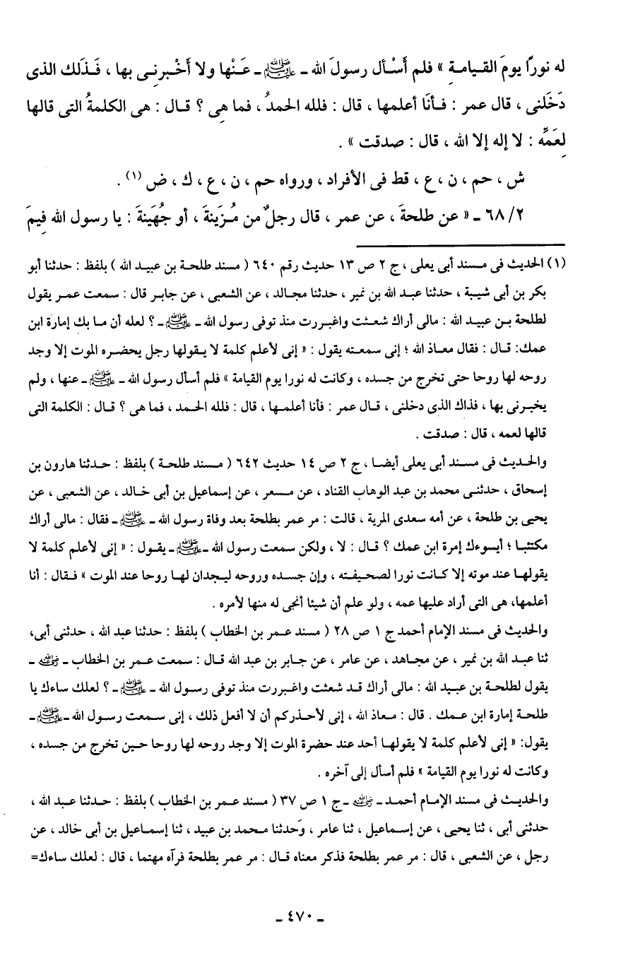 (¬1) الحديث في مسند أبي يعلى، ج 2 ص 13 حديث رقم 640 (مسند طلحة بن عبيد الله) بلفظ: حدثنا أبو بكر بن أبي شيبة، حدثنا عبد الله بن نمير، حدثنا مجالد، عن الشعبي، عن جابر قال: سمعت عمر يقول لطلحة بن عبيد الله: مالي أراك شعثت واغبررت منذ توفى رسول الله - صلى الله عليه وسلم -؟ لعله أن ما بك إمارة ابن عمك: قال: فقال معاذ الله؛ إني سمعته يقول: "إني لأعلم كلمة لا يقولها رجل يحضره الموت إلا وجد روحه لها روحا حتى تخرج من جسده، وكانت له نورا يوم القيامة" فلم أسأل رسول الله - صلى الله عليه وسلم - عنها، ولم يخبرني بها، فذاك الذي دخلني، قال عمر: فأنا أعلمها، قال: فلله الحمد، فما هي؟ قال: الكلمة التي قالها لعمه، قال: صدقت.