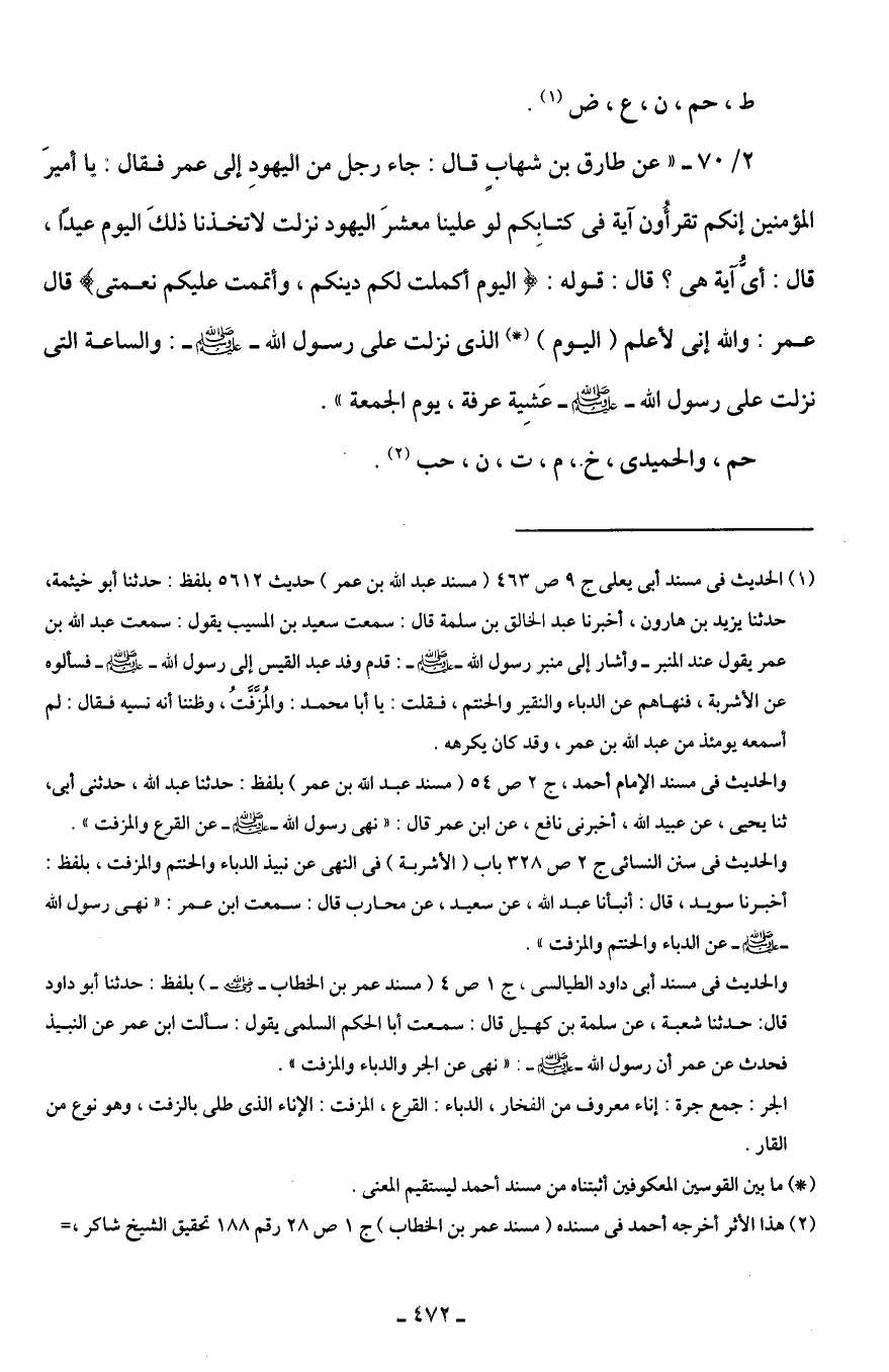 2/ 70 - "عن طارق بن شهابٍ قال: جاء رجل من اليهودِ إلي عمر فقال: يا أميرَ المؤمنين إنكم تقرأُون آية في كتابِكم لو علينا معشرَ اليهود نزلت لاتخذنا ذلكَ اليوم عيدًا، قال: أيُّ آية هي؟ قال: قوله: {الْيَوْمَ أَكْمَلْتُ لَكُمْ دِينَكُمْ وَأَتْمَمْتُ عَلَيْكُمْ نِعْمَتِي} قال عمر: والله إني لأعلم (اليوم) (*) الذي نزلت على رسول الله - صلى الله عليه وسلم -: والساعة التي نزلت على رسول الله - صلى الله عليه وسلم - عَشِية عرفة، يوم الجمعة".