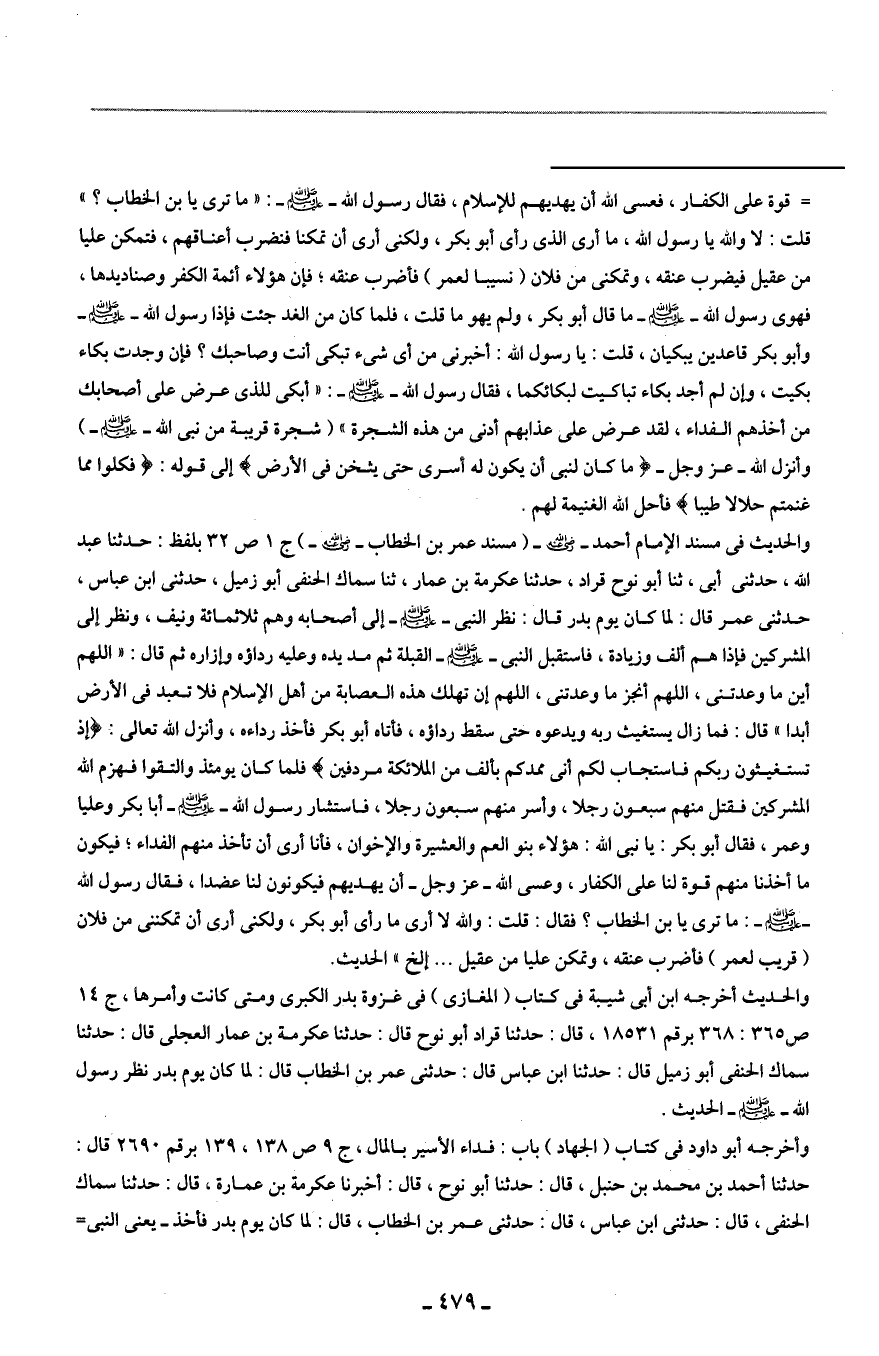 والحديث في مسند الإمام أحمد - رضي الله عنه - (مسند عمر بن الخطاب - رضي الله عنه -) ج 1 ص 32 بلفظ: حدثنا عبد الله، حدثني أبي، ثنا أبو نوح قراد، حدثنا عكرمة بن عمار، ثنا سماك الحنفي أبو زميل، حدثني ابن عباس، حدثني عمر قال: لما كان يوم بدر قال: نظر النبي - صلى الله عليه وسلم - إلى أصحابه وهم ثلاثمائة ونيف، ونظر إلى المشركين فإذا هم ألف وزيادة، فاستقبل النبي - صلى الله عليه وسلم - القبلة ثم مد يده وعليه رداؤه وإزاره ثم قال: "اللهم أين ما وعدتني، اللهم أنجز ما وعدتني، اللهم إن تهلك هذه العصابة من أهل الإسلام فلا تعبد في الأرض أبدا" قال: فما زال يستغيث ربه ويدعوه حتى سقط رداؤه، فأتاه أبو بكر فأخذ رداءه، وأنزل الله تعالى: {إِذْ تَسْتَغِيثُونَ رَبَّكُمْ فَاسْتَجَابَ لَكُمْ أَنِّي مُمِدُّكُمْ بِأَلْفٍ مِنَ الْمَلَائِكَةِ مُرْدِفِينَ} فلما كان يومئذ والتقوا فهزم الله المشركين فقتل منهم سبعون رجلا، وأسر منهم سبعون رجلا، فاستشار رسول الله - صلى الله عليه وسلم - أبا بكر وعليا وعمر، فقال أبو بكر: يا نبي الله: هؤلاء بنو العم والعشيرة والإخوان، فأنا أرى أن تأخذ منهم الفداء؛ فيكون ما أخذنا منهم قوة لنا على الكفار، وعسى الله - عز وجل - أن يهديهم فيكونون لنا عضدا، فقال رسول الله - صلى الله عليه وسلم -: ما ترى يا بن الخطاب؟ فقال: قلت: والله لا أرى ما رأى أبو بكر، ولكني أرى أن تمكنني من فلان (قريب لعمر) فأضرب عنقه، وتمكن عليا من عقيل ... إلخ" الحديث.