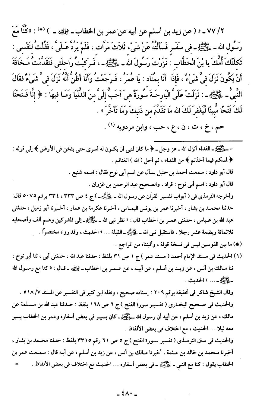 2/ 77 - " (عن زيد بن أسلم عن أبيه عن عمر بن الخطاب - رضي الله عنه -) (*): "كُنَّا مَعَ رَسُولِ الله - صلى الله عليه وسلم - فِي سَفَرٍ فَسَأَلْتُهُ عَنْ شَيْءٍ ثَلَاثَ مَرَّاتٍ، فَلَمْ يَرُدَّ عَلَيَّ، فَقُلْتُ لِنَفْسِي: ثَكِلَتْكَ أُمُّكَ يَا بْنَ الْخَطَّابِ: نَزَرْتَ رَسُولَ الله - صلى الله عليه وسلم -، فَرَكِبْتُ رَاحِلَتِي فَتَقَدَّمْتُ مَخَافَةَ أَنْ يَكُونَ نَزَلَ فِيَّ شَيْءٌ، فَإِذَا أَنَا بِمُنَادٍ: يَا عُمَرُ، فَرَجَعْتُ وَأَنَا أَظُنُّ أَنَّهُ نَزَلَ فِيَّ شَيْءٌ فقَالَ النَّبِيُّ - صلى الله عليه وسلم -: نَزَلَتْ عَلَيَّ الْبَارِحَةَ سُورَةٌ هِيَ أَحَبُّ إِلَيَّ مِنَ الدُّنْيَا وَمَا فِيهَا: {إِنَّا فَتَحْنَا لَكَ فَتْحًا مُبِينًا (1) لِيَغْفِرَ لَكَ اللَّهُ مَا تَقَدَّمَ مِنْ ذَنْبِكَ وَمَا تَأَخَّرَ}.