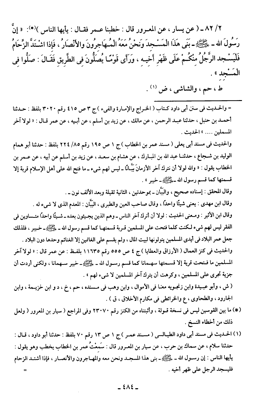 2/ 82 - (عن يسار، عن المعرور قال: خطبنا عمر فقال: يأيها الناس) (*): "إنَّ رَسُولَ الله - صلى الله عليه وسلم - بَنَى هَذَا الْمَسْجِدَ وَنحْنُ مَعَهُ الْمُهَاجِرُونَ والأنْصَارُ، فَإِذا اشْتَدَّ الزِّحَامُ فَليَسْجد الرَّجُلُ مِنْكُمْ عَلَى ظَهْرِ أَخِيهِ، وَرَأَى قَوْمًا يُصَلُّونَ فِى الطَّرِيق فَقَالَ: صَلُّوا فِى الْمَسْجِدِ".