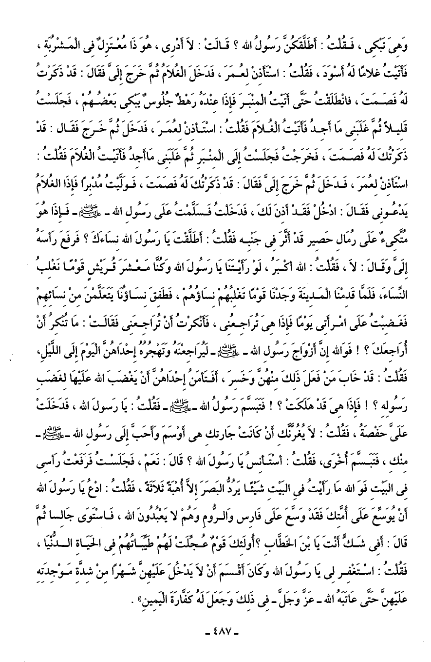 وَهِىَ تَبْكِى، فَقُلْتُ: أَطَلَّقَكُنَّ رَسُولُ الله؟ قَالَتْ: لَا أَدْرِى، هُوَ ذَا مُعْتَزِلٌ في الْمَشْرُبَةِ، فَأَتَيْتُ غلامًا لَهُ أَسْوَدَ، فَقُلْتُ: اسْتَأَذِنْ لِعُمَرَ، فَدَخَلَ الْغُلَامُ ثُمَّ خَرَجَ إِلَىَّ فَقَالَ: قَدْ ذَكَرْتُ لَهُ فَصَمَتَ، فانْطَلَقْتُ حَتَّى أَتَيْتُ الْمِنْبَرَ فَإِذَا عِنْدَهُ رَهْطٌ جُلُوسٌ يَبْكِى بَعْضُهُمْ، فَجَلَسْتُ قَلِيلًا ثُمَّ غَلَبَنِى مَا أجِدُ فَأَتَيْتُ الْغُلَامَ فَقُلْتُ: اسْتَأذِنْ لِعُمَرَ، فَدَخَلَ ثُمَّ خَرَجَ فَقَال: قَدْ ذَكَرْتُكَ لَهُ فَصَمَتَ، فَخَرَجْتُ فَجَلَسْتُ إِلَى الْمِنْبَرِ ثُمَّ غَلَبَنِى مَا أَجِدُ فَأَتَيْتُ الْغُلَامَ فَقُلْتُ: اسْتَأذِنْ لِعُمَرَ، فَدَخَلَ ثُمَّ خَرَجَ إِلَىَّ فَقَالَ: قَدْ ذَكَرْتُكَ لَهُ فَصَمَتَ، فَوَلَّيْتُ مُدْبِرًا فَإِذَا الغُلَامُ يَدْعُونِي فَقَالَ: ادْخُلْ فَقَدْ أَذِنَ لَكَ، فَدَخَلْتُ فَسَلَّمْتُ عَلَى رَسُولِ الله - صلى الله عليه وسلم - فَإِذَا هُوَ مُتَّكِئٌ عَلَى رُمَالِ حَصِير قَدْ أَثَّرَ في جَنْبِه فَقُلْتُ: أَطَلَّقْتَ يَا رَسُولَ الله نِسَاءَكَ؟ فَرفَعَ رَأسَهُ إِلَىَّ وَقَالَ: لَا، فَقُلْتُ: الله أكْبَرُ، لَوْ رَأَيْتَنَا يَا رَسُولَ الله وَكُنَّا مَعْشَرَ قُرَيْشٍ قَوْمًا نَغْلِبُ النِّسَاءَ، فَلَمَّا قَدِمْنَا الْمَدِينَةَ وَجَدْنَا قَوْمًا تَغْلِبُهُمْ نِسَاؤهُمْ، فَطَفِقَ نِسَاؤُنَا يَتَعَلَّمْنَ مِنْ نِسَائِهمْ فَغَضِبْتُ عَلَى امْرأَتِى يَوْمًا فَإِذَا هِىَ تُرَاجِعُنِى، فَأَنْكرْتُ أَنْ تُرَاجِعَنِى فَقَالَتْ: ما تُنكِرُ أَنْ أُرَاجِعَكَ؟ ! فَوَالله إِنَّ أَزْوَاجَ رَسُولِ الله - صلى الله عليه وسلم - لَيُرَاجِعْنَهُ وَتَهْجُرهُ إِحْدَاهُنَّ الْيَومَ إِلَى اللَّيْلِ, فَقُلْتُ: قَدْ خَابَ مَنْ فَعَلَ ذَلِكَ مِنْهُنَّ وَخَسِرَ، أَفَتَأمَنُ إِحْدَاهُنَّ أَنْ يَغْضَبَ الله عَلَيْهَا لِغَضَبِ رَسُولِهِ؟ ! فَإِذَا هِىَ قَدْ هَلَكَتْ؟ ! فَتَبَسَّمَ رَسُولُ الله - صلى الله عليه وسلم - فَقُلْتُ: يَا رَسولَ الله، فَدَخَلَتْ عَلَىَّ حَفْصَةُ، فَقُلْتُ: لَا يُغُرَّنَّكِ أَنْ كَانَتْ جَارتكِ هى أَوْسَمَ وَأَحَبَّ إِلَى رَسُولِ الله - صلى الله عليه وسلم - مِنْكِ، فَتَبَسَّمَ أُخْرَى، فَقُلْتُ: أسْتَأنِسُ يَا رَسُولَ الله؟ قَالَ: نَعَمْ، فَجَلَسْتُ فَرَفَعْتُ رَأسِى فِى الْبَيْتِ فَوَالله مَا رَأَيْتُ فِى البَيْتِ شَيْئًا يَرُدُّ البَصَرَ إلَّا أُهْبَةً ثَلَاثَةً، فَقُلْتُ: ادْعُ يَا رَسُولَ الله أَنْ يُوَسِّعَ عَلَى أُمَّتِكَ فَقَدْ وَسَّعَ عَلَى فَارِس وَالرُّومِ وَهُمْ لا يَعْبُدُونَ الله، فَاسْتَوَى جَالِسًا ثُمَّ قَالَ: أَفِى شَكٍّ أَنْتَ يَا بْنَ الخَطَّابِ؟ أُولَئِكَ قَوْمٌ عُجِّلَتْ لَهُمْ طَيِّبَاتُهُمْ فِى الحَيَاةِ الدُّنْيَا، فَقُلْتُ: اسْتَغْفِر لِي يَا رَسُولَ الله وَكَانَ أَقْسَمَ أَنْ لَا يَدْخُلَ عَلَيْهِنَّ شَهْرًا مِنْ شِدَّةِ مَوْجِدَتِهِ عَلَيْهِنَّ حَتَّى عَاتَبَهُ الله - عَزَّ وَجَلَّ - فِى ذَلِكَ وَجَعَلَ لَهُ كَفَّارَةَ الْيَمِينِ".