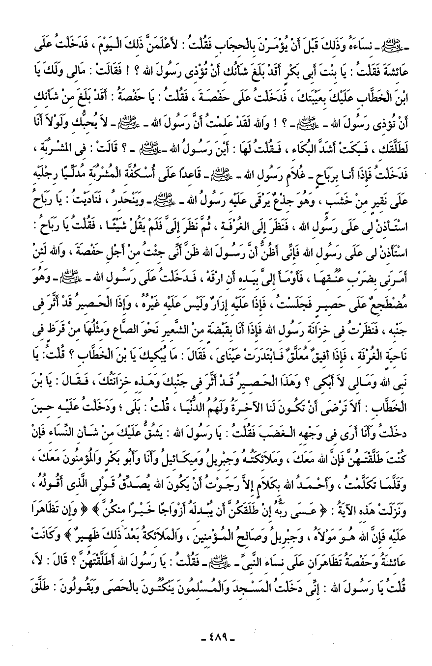 - صلى الله عليه وسلم - نِسَاءَهُ وَذَلِكَ قَبْلَ أنْ يُؤْمَرْنَ بِالْحِجَابِ فَقُلْتُ: لأَعْلَمَنَّ ذَلِكَ الْيَوْمَ، فَدَخَلْتُ عَلَى عَائِشَةَ فَقلْتُ: يَا بِنْتَ أَبِى بَكْرٍ أَقَدْ بَلَغَ شَأنُكِ أَنْ تُؤْذِى رَسُولَ الله؟ ! فَقَالَتْ: مَالِى وَلَكَ يَا ابْنَ الْخَطَّابِ عَلَيْكَ بِعَيْبَتكَ، فَدَخَلتُ عَلَى حَفْصَةَ، فَقُلْتُ: يَا حَفْصَةُ: أَقَدْ بَلَغَ مِنْ شَأنِكِ أَنْ تُؤذِى رَسُولَ الله - صلى الله عليه وسلم -؟ ! وَالله لَقَدْ عَلِمْتُ أنَّ رَسُولَ الله - صلى الله عليه وسلم - لَا يُحِبُّكِ وَلَوْلَا أَنَا لَطَلَّقَك، فَبَكَتْ أَشَدَّ البُكَاءِ، فَقُلْتُ لَهَا: أَيْنَ رَسُولُ الله - صلى الله عليه وسلم -؟ قَالَتْ: في المشْرُبَةِ، فَدَخَلْتُ فَإِذَا أَنا بِرَبَاحٍ - غُلامِ رَسُولِ الله - صلى الله عليه وسلم - قَاعِدًا عَلَى أُسْكُفَّةِ الْمُشْرُبَةِ مُدَلِّيًا رِجْلَيْهِ عَلَى نَقِيرٍ مِنْ خَشَبٍ، وَهُوَ جِذْعٌ يَرْقَى عَلَيْهِ رَسُولُ الله - صلى الله عليه وسلم - وَيَنْحَدِرُ، فَنَادَيْتُ: يَا رَبَاحُ اسْتَأذِنْ لِى عَلَى رَسُولِ الله، فَنَظَرَ إِلَى الغُرْفَةِ، ثُمَّ نَظَرَ إِلَىَّ فَلَمْ يَقُلْ شَيْئًا، فَقُلتُ يَا رَبَاحُ: اسْتَأَذِنْ لى عَلَى رَسُولِ الله فَإنِّى أَظُنُّ أنَّ رَسُولَ الله ظَنَّ أَنِّى جِئْتُ مِنْ أجْلِ حَفْصَةَ، وَالله لَئِنْ أَمَرَنِى بِضَرْبِ عُنُقِهَا، فَأَومَأَ إِلىَّ بِيَدِهِ أَنِ ارْقَهْ، فَدَخَلْتُ عَلَى رَسُولِ الله - صلى الله عليه وسلم - وَهُوَ مُضْطَجِعٌ عَلَى حَصِيرٍ فَجَلَسْتُ، فَإِذَا عَلَيْهِ إِزَارٌ وَلَيْسَ عَلَيْهِ غَيْرُهُ، وَإِذَا الْحَصِير قَدْ أثَّرَ فِى جَنْبِه، فَنَظَرْتُ فِى خِزَانَة رَسُولِ الله فَإِذَا أنَا بِقَبْضَةٍ مِنْ الشَّعِيرِ نَحْوَ الصَّاع وَمِثْلُهَا مِنْ قَرَظٍ فِى نَاحِيَةٍ الْغُرْفَةِ، فَإِذَا أفِيقٌ مُعَلَّقٌ فَابْتَدَرَتْ عَيْنَاىَ، فَقَالَ: مَا يُبْكِيكَ يَا بْنَ الْخَطَّابِ؟ قُلْتُ: يَا نَبِى الله وَمَالِى لَا أَبْكِى؟ وَهَذَا الْحَصِيِرُ قَدْ أَثَّرَ في جَنْبِكَ وَهَذِهِ خِزَانَتُكَ، فَقَالَ: يَا بْنَ الْخَطَّابِ: أَلَا تَرْضَى أَنْ تَكُونَ لَنا الآخِرَةُ وَلَهُمُ الدُّنْيَا، قُلْتُ: بَلَى؛ وَدَخَلْتُ عَلَيْهِ حِينَ دخَلْتُ وَأنَا أَرَى في وَجْهِهِ الْغَضَبَ فَقُلْتُ: يَا رَسُولَ الله: يَشُقُّ عَلَيْكَ مِنْ شَأنِ النِّسَاءِ فَإنْ كُنْتَ طَلَّقْتَهُنَّ فَإنَّ الله مَعَكَ، وَمَلَائِكَتُهُ وَجِبْرِيلُ وَمِيكَائِيلُ وَأَنَا وَأبُو بَكْرٍ وَالمُؤمِنُونَ مَعَكَ، وَقَلَّمَا تَكَلَّمْتُ، وَأَحْمَدُ الله بكَلَامٍ إِلَّا رَجَوْتُ أَنْ يَكُونَ الله يُصَدِّقُ قَوْلِى الَّذِى أَقُولُهُ، وَنَزَلَتْ هَذِهِ الآيَةُ: {عَسَى رَبُّهُ إِنْ طَلَّقَكُنَّ أَنْ يُبْدِلَهُ أَزْوَاجًا خَيْرًا مِنْكُنَّ} {وَإِنْ تَظَاهَرَا عَلَيْهِ فَإِنَّ اللَّهَ هُوَ مَوْلَاهُ وَجِبْرِيلُ وَصَالِحُ الْمُؤْمِنِينَ وَالْمَلَائِكَةُ بَعْدَ ذَلِكَ ظَهِيرٌ} وَكَانَتْ عَائِشَةُ وَحَفْصَةُ تَظَاهَرَانِ عَلَى نِسَاءِ النَّبِىِّ - صلى الله عليه وسلم - فَقُلْتُ: يَا رَسُولَ الله أَطَلَّقتَهُنَّ؟ قَالَ: لَا، قُلْتُ يَا رَسُولَ الله: إِنِّي دَخَلْتُ الْمَسْجِدَ وَالْمُسْلِمُونَ يَنْكُتُونَ بالْحَصَى وَيَقُولُونَ: طَلَّقَ