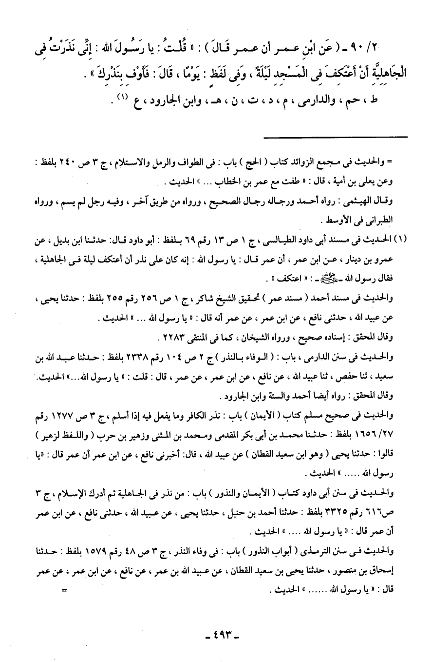 2/ 90 - (عَن ابْنِ عمر أن عمر قَالَ): "قُلْتُ: يا رَسُولَ الله: إِنِّى نَذَرْتُ فِى الْجَاهِلِيَّةِ أَنْ أَعْتَكِفَ فِى الْمَسْجِدِ لَيْلَةً، وَفِى لَفَظٍ: يَوْمًا، قَالَ: فَأَوْفِ بِنَذْرِكَ".