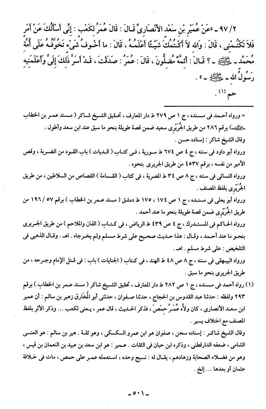 وقال الشيخ شاكر: إسناده حسن، صفوان هو ابن عمرو السكسكى، وهو ثقة. هير بن سالم: هو العنسى الشامى، ضعفه الدارقطنى، وذكره ابن حبان في الثقات. عمير: هو ابن سعد بن عبيد بن النعمان بن قيس، وهو من فضلاء الصحابة وزهادهم، يقال له: نسيج وحده، استعمله عمر على حمص، مات في خلافة عثمان أو بعدها ... إلخ.