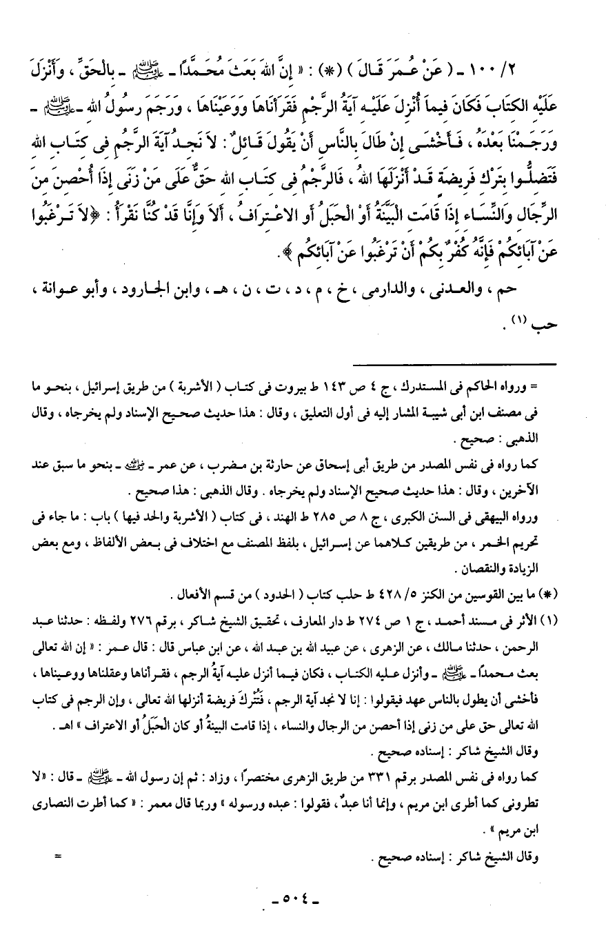 (¬1) الأثر في مسند أحمد، ج 1 ص 274 ط دار المعارف، تحقيق الشيخ شاكر، برقم 276 ولفظه: حدثنا عبد الرحمن، حدثنا مالك، عن الزهرى، عن عبيد الله بن عبد الله، عن ابن عباس قال: قال عمر: "إن الله تعالى بعث محمدًا - صلى الله عليه وسلم - وأنزل عليه الكتاب، فكان فيما أنزل عليه آيةُ الرجم، فقرأناها وعقلناها ووعيناها، فأخشى أن يطول بالناس عهد فيقولوا: إنا لا نجد آية الرجم، فَتُتْركَ فريضة أنزلها الله تعالى، وإن الرجم في كتاب الله تعالى حق على من زنى إذا أحصن من الرجال والنساء، إذا قامت البينةُ أو كان الحَبَلُ أو الاعتراف" اهـ.