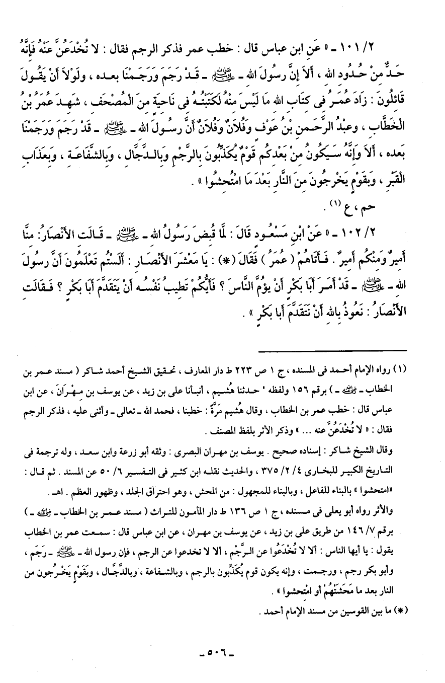 2/ 101 - "عَنِ ابن عباس قال: خطب عمر فذكر الرجم فقال: لا تُخْدَعُنَّ عَنْهُ فَإِنَّهُ حَدٌّ مِنْ حُدُودِ اللهِ، أَلَا إِنَّ رسُولَ اللهِ - صلى الله عليه وسلم - قَدْ رَجَمَ وَرَجَمْنَا بعده، ولَوْلَا أَنْ يَقُولَ قَائِلُونَ: زَادَ عُمَرُ في كِتَابِ اللهِ مَا لَيْسَ مِنْهُ لَكَتَبْتُهُ فِى نَاحِيَةٍ مِنَ الْمُصْحَفِ، شَهِدَ عُمَرُ بْنُ الْخَطَّابِ، وعبْدُ الرَّحَمنِ بْنُ عَوْفٍ وَفُلَانٌ وَفُلَانٌ أَنَّ رسُولَ اللهِ - صلى الله عليه وسلم - قَدْ رَجَمَ وَرَجَمْنَا بَعده، أَلَا وَإِنَّهُ سَيَكُونُ مِنْ بَعْدِكُم قَوْمٌ يُكَذِّبُونَ بِالرَّجْم وَبِالدَّجَّالِ، وَبِالشَّفَاعَةِ، وَبِعَذَابِ الْقَبْرِ، وَبقَوْمٍ يَخْرجُونَ مِنَ النَّارِ بَعْدَ مَا امْتُحِشُوا".