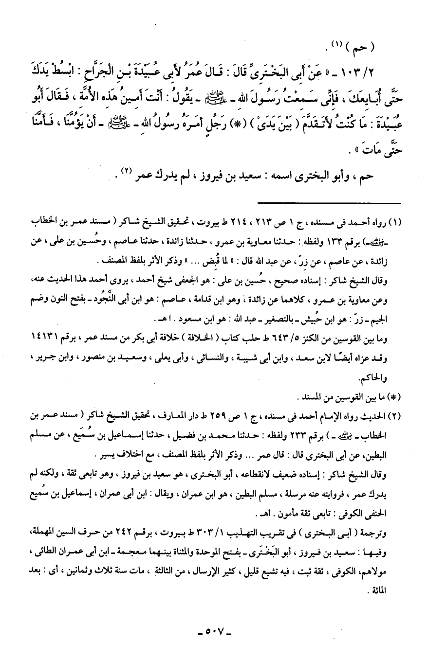 2/ 103 - "عَنْ أبِى البَخْتَرِىِّ قَالَ: قَالَ عُمَرُ لأَبِى عُبَيْدَةَ بْنِ الْجَرَّاحِ: ابْسُطْ يَدَكَ حَتَّى أُبَايِعَكَ، فَإِنِّي سَمِعْتُ رَسُولَ اللهِ - صلى الله عليه وسلم - يَقُولُ: أَنْتَ أَمِينُ هَذِه الأُمَّةِ، فَقَالَ أبُو عُبَيْدَةَ: مَا كُنْتُ لأَتَقَدَّمَ (بَيْنَ يَدَىْ) (*) رَجُلٍ أمَرَهُ رسُولُ اللهِ - صلى الله عليه وسلم - أَنْ يَؤُمَّنَا، فَأَمَّنَا حَتَّى مَاتَ".