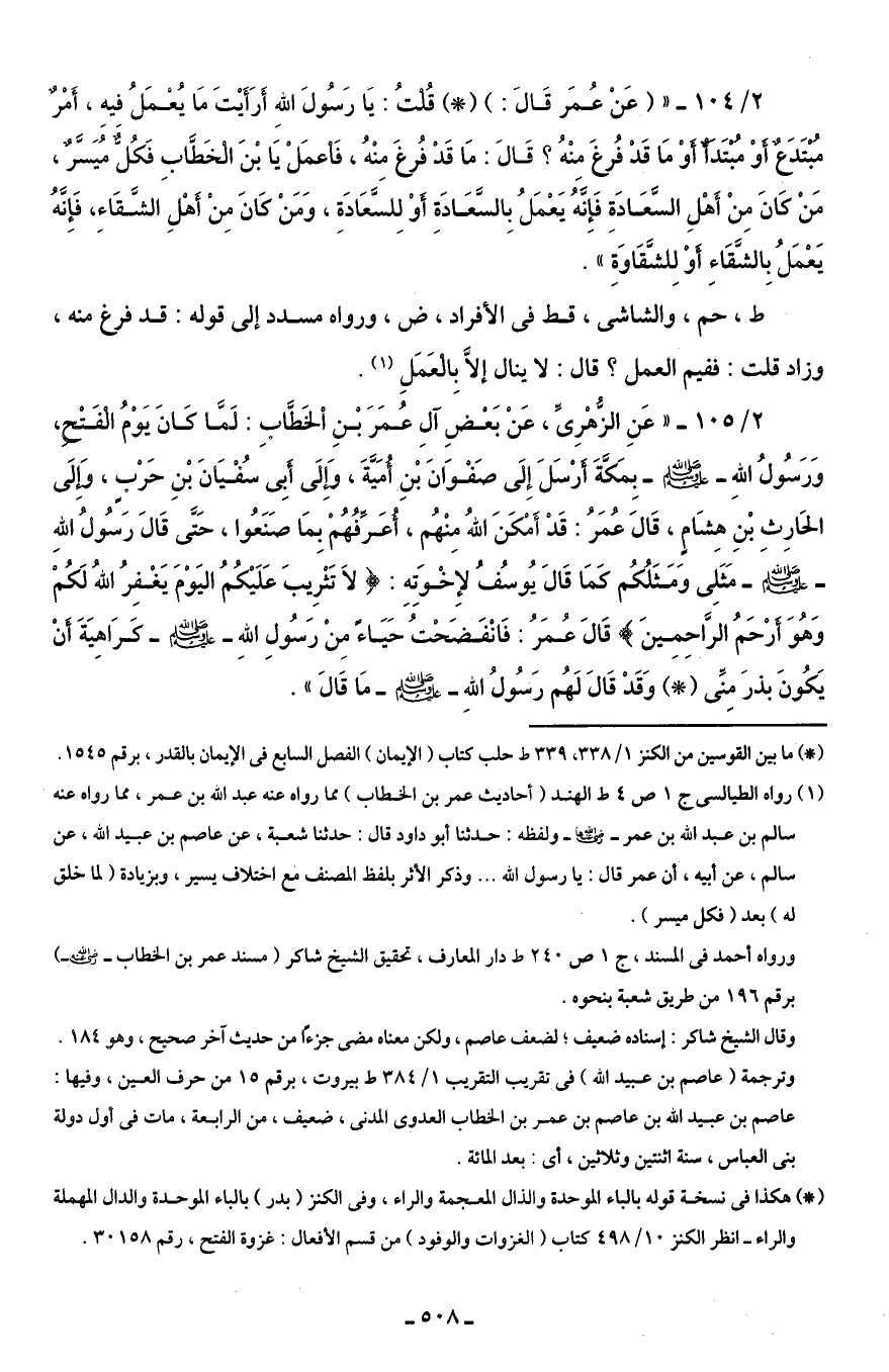2/ 104 - " (عَنْ عُمَر قَالَ: ) (*) قُلْتُ: يَا رَسُولَ اللهِ أرَأَيْتَ مَا يُعْمَلُ فِيهِ، أَمْرٌ مُبْتَدَعٌ أَوْ مُبتَدَأٌ أَوْ مَا قَدْ فُرغَ مِنْهُ؟ قَالَ: مَا قَدْ فُرغَ مِنْهُ، فَاعمَلْ يَا بْنَ الْخَطَّابِ فَكُلٌّ مُيَسَّرٌ، مَنْ كَانَ مِنْ أَهْلِ السَّعَادَةِ فَإِنَّهُ يَعْمَلُ بِالسَّعَادَةِ أَوْ لِلسَّعَادَةِ، وَمَنْ كَانَ مِنْ أَهْلِ الشَّقَاءِ، فَإِنَّهُ يَعْمَلُ بِالشَّقَاءِ أَوْ لِلشَّقَاوَةِ".