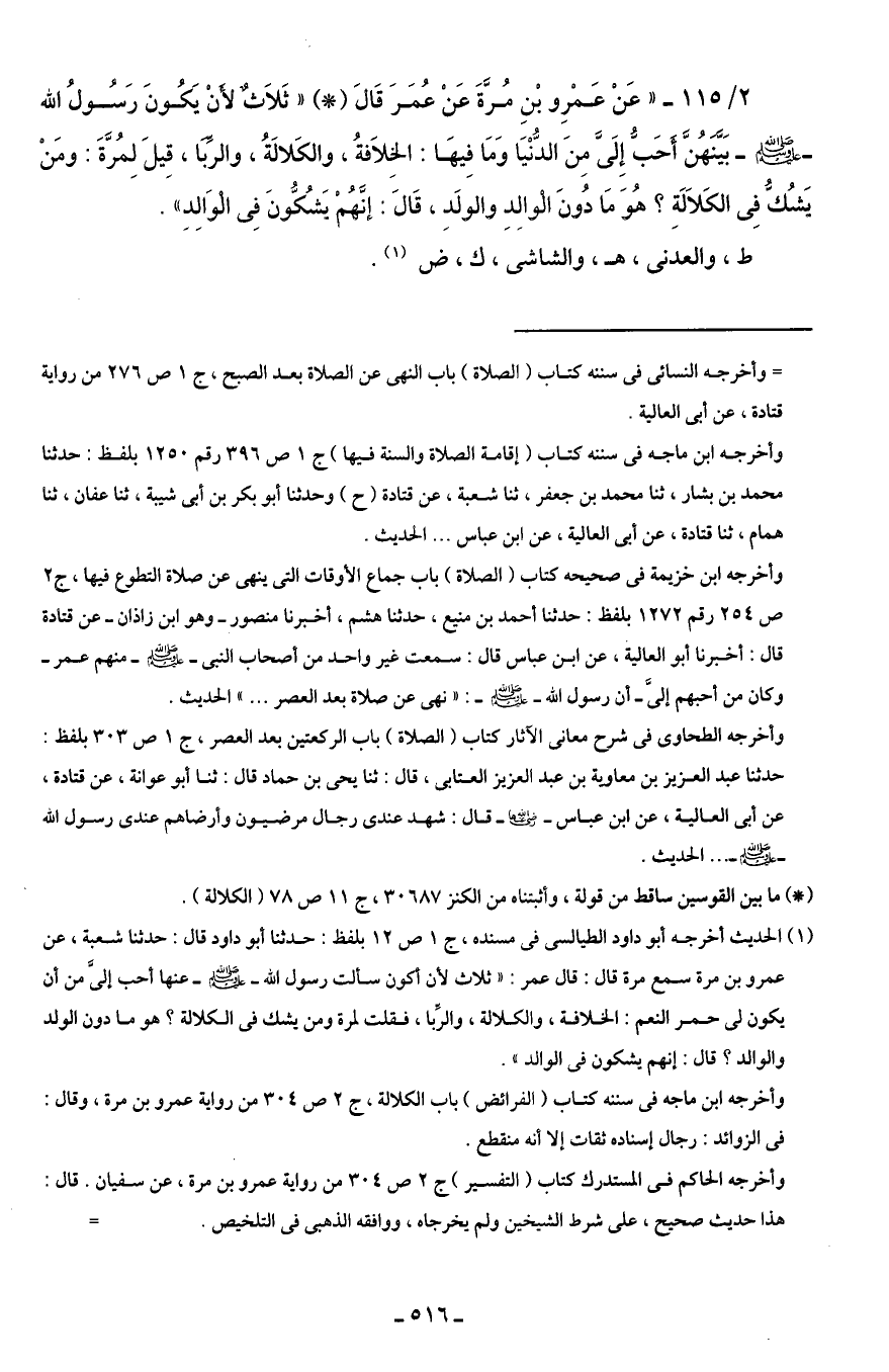 2/ 115 - "عَنْ عَمْرِو بْنِ مُرَّةَ عَنْ عُمَرَ قَالَ (*) "ثَلَاثٌ لأَنْ يَكُونَ رَسُولُ الله - صلى الله عليه وسلم - بَيَّنَهُنَّ أَحَبُّ إِلَىَّ مِنَ الدُّنْيَا وَمَا فِيهَا: الخِلَافةُ، والكَلالَةُ، والرِّبَا، قِيلَ لِمُرَّةَ: ومَنْ يَشُكُّ فِي الكَلَالَةِ؟ هُوَ مَا دُونَ الْوالِدِ والولَدِ، قَالَ: إنَّهُمْ يَشُكُّونَ فِي الْوَالِدِ".