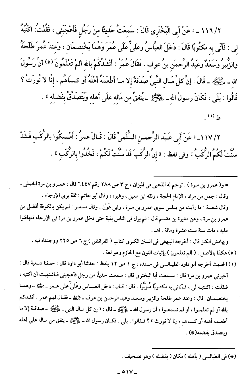 2/ 116 - "عَنْ أَبِى الْبَخْتَرِى قَالَ: سَمِعْتُ حَدِيثًا مِنْ رَجُلٍ فَأَعْجَبَنِى، فَقُلْتُ: اكْتُبْهُ لِى: فَأَتَى بِهِ مكتُوبًا قَالَ: دَخَلَ العبَّاسُ وعَلىٌّ عَلَى عُمَرَ وَهُمَا يَخْتصِمَانِ، وَعِندَ عُمرَ طَلْحَةُ والزُّبيرُ وَسَعْدٌ وعَبدُ الرَّحمَنِ بنُ عوفٍ، فَقَالَ عُمَرُ: أَنْشُدُكُمْ باللهِ ألمْ تَعْلَمُونَ (*) أنَّ رَسُولَ اللهِ - صلى الله عليه وسلم - قَالَ: إنَّ كلَّ مَالِ النَّبِىِّ صَدَقةٌ إِلا ما أَطْعَمَهُ أَهْلَهُ أَو كسَاهُم، إِنَّا لا نُورَثُ؟ قَالُوا: بَلَى، فَكَانَ رسولُ اللهِ - صلى الله عليه وسلم - يُنفِقُ مِن مَالِهِ علَى أَهلِهِ وَيَتَصَدَّقُ بِفَضلِهِ".