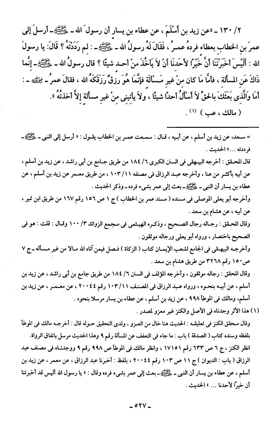 2/ 130 - "عن زيد بن أَسْلَمَ، عن عطاء بن يسارٍ أن رسولَ الله - صلى الله عليه وسلم - أرسلَ إلى عمرَ بنِ الخطابِ بعطاءٍ فردهُ عمرُ، فَقَالَ لَهُ رسولُ الله - صلى الله عليه وسلم -: لِم رَدَدْتَهُ؟ قَالَ: يا رسولَ الله: أَلَيْسَ أخَبَرْتَنَا أَنَّ خَيْرًا لأَحَدِنَا أَنْ لَا يَأخُذَ منْ أحدٍ شيئًا؟ قال رسولُ الله - صلى الله عليه وسلم - إِنَّما ذَاكَ عَن المسأَلةِ، فأمَّا مَا كان مِنْ غيرِ مَسْألَةٍ فإنَّمَا هُوَ رزقٌ رَزَقَكَهُ الله، فقال عمرُ - رضي الله عنه -: أمَا وَالَّذِى بَعَثَكَ بالحقِّ لَا أَسْأَلُ أحدًا شيئًا، ولَا يأتِينِي مِنْ غيرِ مسأَلةٍ إِلَّا أخذتُهُ".