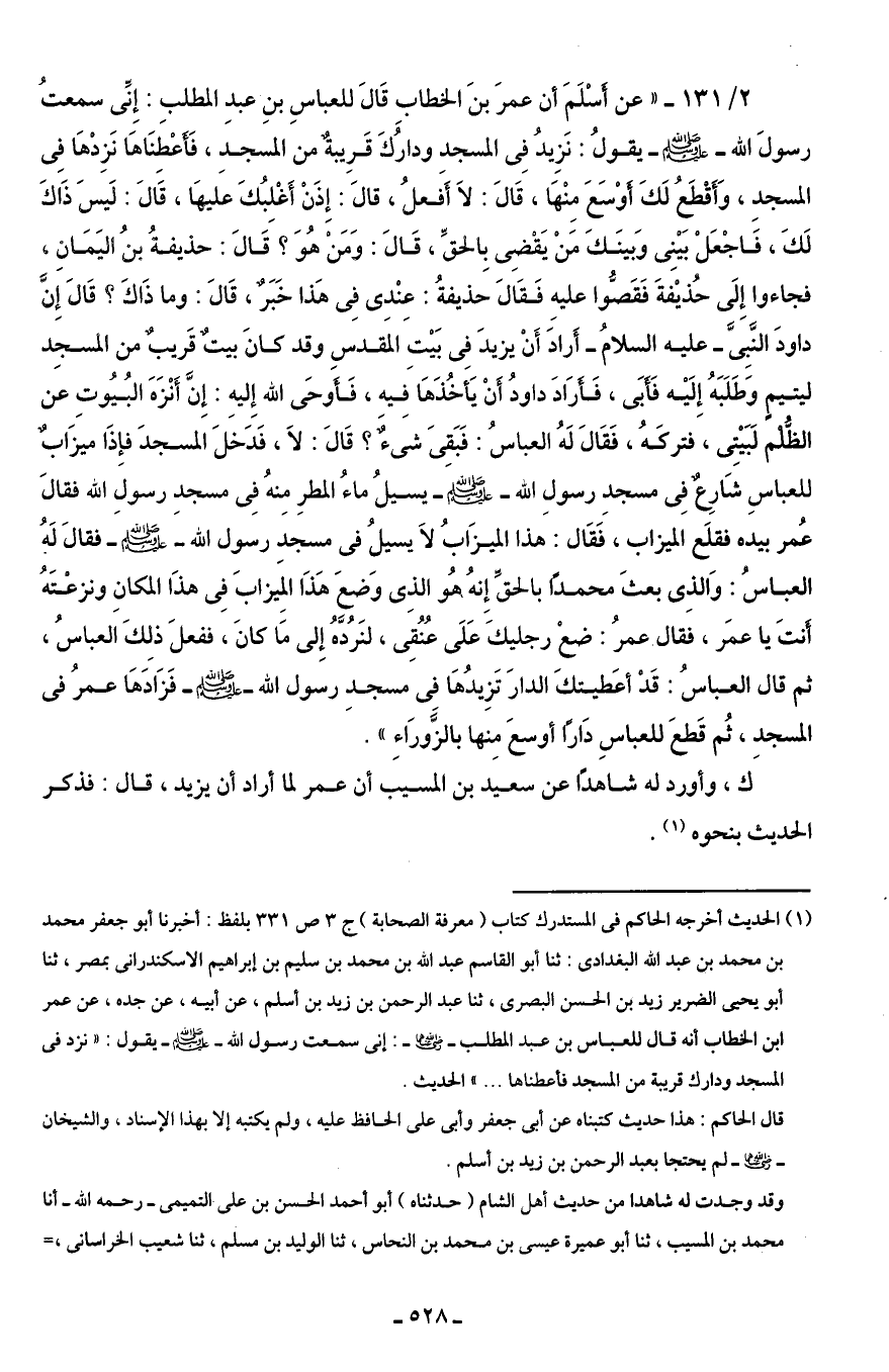 2/ 131 - "عن أَسْلَمِ أن عمرَ بنَ الخطابِ قَالَ للعباسِ بنِ عبد المطلبِ: إِنِّى سمعتُ رسولَ الله - صلى الله عليه وسلم - يقولُ: نَزِيدُ فِى المسجد ودارُكَ قَرِيبةٌ من المسجدِ، فَأَعْطِنَاهَا نَزِدْهَا فِى المسجدِ، وَأَقْطَعُ لَكَ أَوْسَعَ مِنْهَا، قَالَ: لَا أَفَعلُ، قالَ: إِذَنْ أَغْلِبُكَ عَليهَا، قَالَ: لَيسَ ذَاكَ لَكَ، فَاجْعَلْ بَيْنِى وَبينَكَ مَنْ يَقْضِى بِالحقِّ، قَالَ: وَمَن هُوَ؟ قَالَ: حذيفةُ بنُ اليَمَانِ, فجاءوا إِلَى حُذيْفةَ فَقَصُّوا عليه فَقَالَ حذيفةُ: عِنْدِى في هَذا خَبَرٌ، قَالَ: وما ذَاكَ؟ قَالَ إِنَّ داودَ النَّبِىَّ - عليه السلامُ - أَرادَ أَنْ يزيدَ فِى بَيْتِ المَقدسِ وقد كانَ بيتٌ قَريبٌ من المسجِد ليتيمٍ وَطَلَبَهُ إِلَيْه فَأَبَى، فَأَرَادَ داودُ أَنْ يَأخُذَهَا فِيه، فَأَوحَى الله إِليه: إِنَّ أَنْزَهَ البُيُوتِ عن الظُّلْم لَبَيْتِى، فتركَهُ، فَقَالَ لَهُ العباسُ: فَبَقِىَ شيءٌ؟ قَالَ: لَا، فَدَخَلَ المسجدَ فإذَا ميزَابٌ للعباسِ شَارِعٌ فِى مسجدِ رسولِ الله - صلى الله عليه وسلم - يسيلُ ماءُ المطرِ مِنهُ فِى مسجدِ رسولِ الله فقالَ عُمر بيده فقلَع الميزاب، فَقَال: هذا الميزَابُ لَا يسيلُ في مسجد رسول الله - صلى الله عليه وسلم - فقالَ لَهُ العباسُ: وَالذِى بعثَ محمدًا بالحقِّ إِنهُ، هُو الذِى وَضعَ هَذَا المِيَزابَ في هذَا المكانِ ونزعْتَهُ أَنتَ يا عمَر، فَقال عمرُ: ضعْ رجليكَ عَلَى عُنُقِى، لنَرُدَّهُ إِلى مَا كانَ، ففعلَ ذلِكَ العباسُ، ثم قال العباسُ: قَدْ أعَطيتكَ الدارَ تَزِيدُهَا في مسجدِ رسول الله - صلى الله عليه وسلم - فَزَادَهَا عمرُ في المسجدِ، ثُم قَطعَ للعباسِ دَارًا أوسعَ مِنها بالزَّورَاءِ".