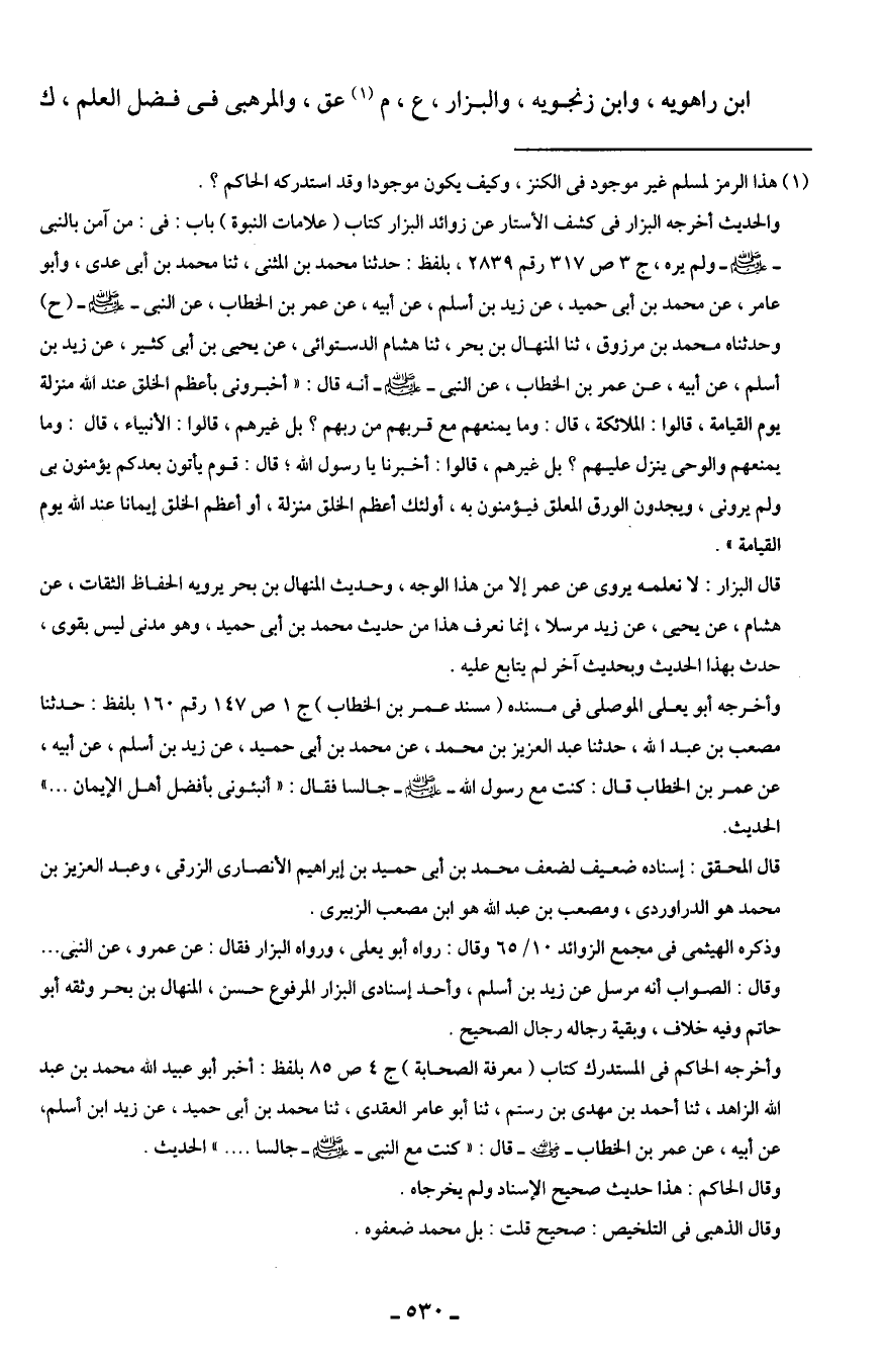 وأخرجه الحاكم في المستدرك كتاب (معرفة الصحابة) ج 4 ص 85 بلفظ: أخبر أبو عبيد الله محمَّد بن عبد الله الزاهد، ثنا أحمد بن مهدى بن رستم، ثنا أبو عامر العقدى، ثنا محمَّد بن أبى حميد، عن زيد بن أسلم، عن أبيه، عن عمر بن الخطاب - رضي الله عنه - قال: "كنت مع النبى - صلى الله عليه وسلم - جالسا .... " الحديث.
