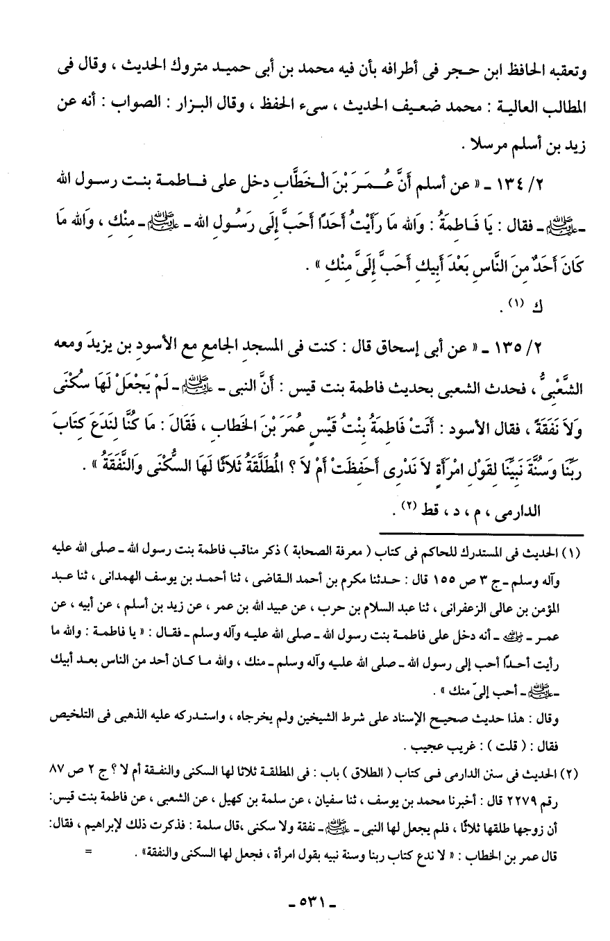 2/ 135 - "عن أبى إسحاق قال: كنت في المسجدِ الجامعِ مع الأسودِ بن يزيدَ ومعه الشَّعْبِىُّ، فحدث الشعبى بحديث فاطمة بنت قيس: أنَّ النبى - صلى الله عليه وسلم - لَمْ يَجْعَلْ لَهَا سُكْنَى وَلَا نَفَقَةً، فقال الأسود: أَتَتْ فَاطِمَةُ بِنْتُ قَيْسٍ عُمَرَ بْنَ الخَطابِ، فَقَالَ: مَا كُنَّا لِنَدَعَ كِتَابَ رَبِّنَا وَسُنَّةَ نَبِيِّنَا لِقَوْلِ امْرَأَةٍ لَا نَدْرِى أَحَفِظَتْ أمْ لَا؟ المُطَلَّقَةُ ثَلَاثًا لَهَا السُّكْنَى وَالنَّفَقَةُ".