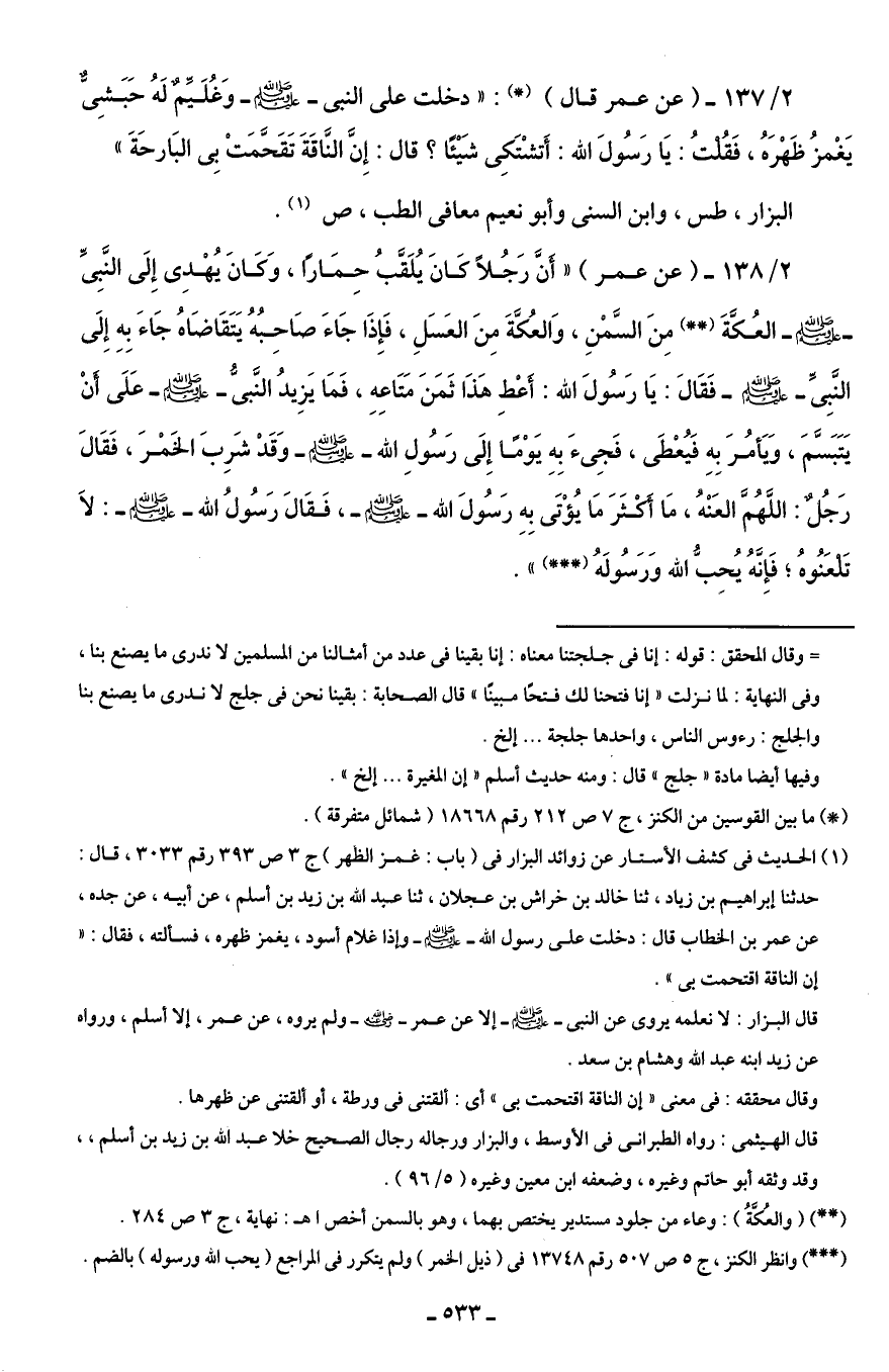 (¬1) الحديث في كشف الأستار عن زوائد البزار في (باب: غمز الظهر) ج 3 ص 393 رقم 3033، قال: حدثنا إبراهيم بن زياد، ثنا خالد بن خراش بن عجلان، ثنا عبد الله بن زيد بن أسلم، عن أبيه، عن جده، عن عمر بن الخطاب قال: دخلت على رسول الله - صلى الله عليه وسلم - وإذا غلام أسود، يغمز ظهره، فسألته، فقال: "إن الناقة اقنحمت بى".
