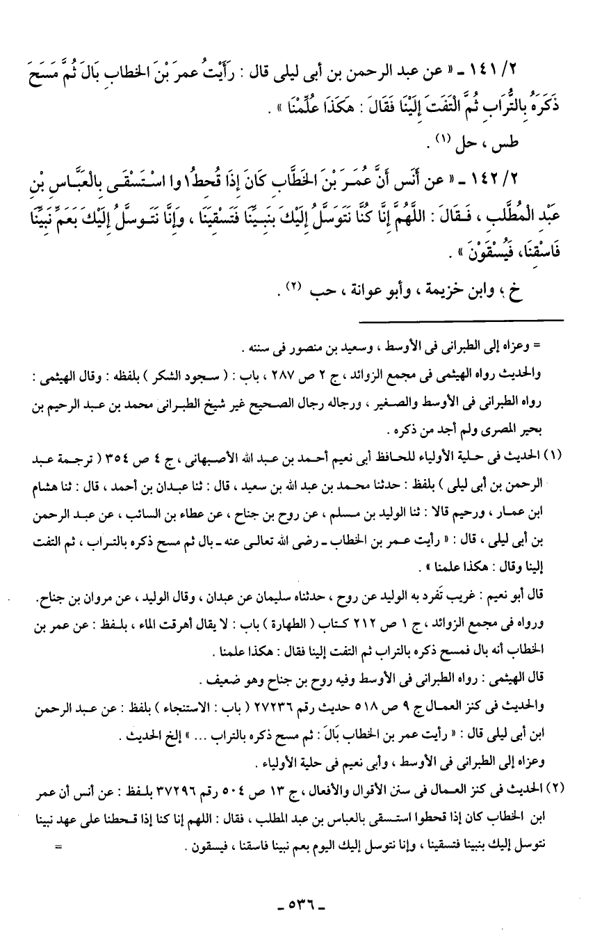 (¬2) الحديث في كنز العمال في سنن الأقوال والأفعال، ج 13 ص 504 رقم 37296 بلفظ: عن أنس أن عمر بن الخطاب كان إذا قحطوا استسقى بالعباس بن عبد المطلب، فقال: اللهم إنا كنا إذا قحطنا على عهد نبينا نتوسل إليك بنبينا فتسقينا، وإنا نتوسل إليك اليوم بعم نبينا فاسقنا، فيسقون. =