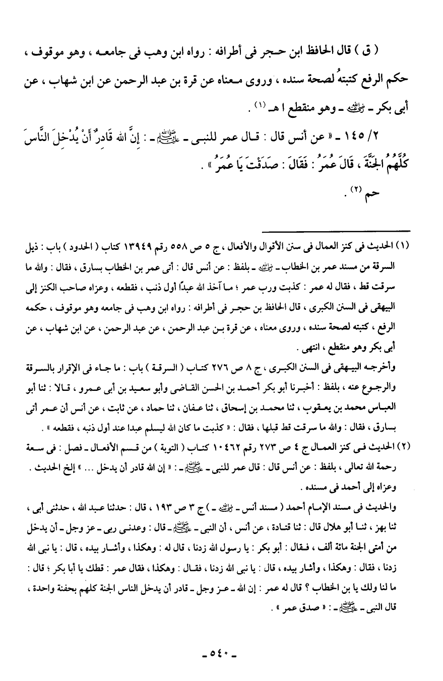 2/ 145 - "عن أنس قال: قال عمر للنبى - صلى الله عليه وسلم -: إِنَّ الله قَادِرٌ أَنْ يُدْخِلَ النَّاسَ كُلَّهُمُ الجَنَّةَ، قَالَ عُمَرُ: فَقَالَ: صَدَقْتَ يَا عُمَرُ".