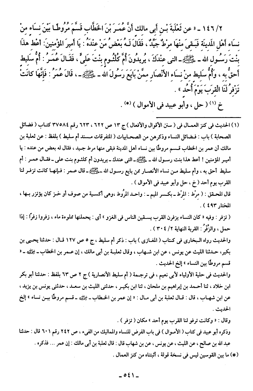 2/ 146 - "عن ثَعْلَبةَ بْنِ أَبِى مالِكٍ أَنَّ عُمَرَ بْنَ الخَطَّابِ قَسَّمَ مُرُوطًا بَيْنَ نِسَاءٍ مِنْ نِسَاءِ أَهْلِ المَدِينَةِ فَبَقِىَ مِنْهَا مِرْطٌ جَيِّدٌ، فَقَالَ لَهُ بَعْضُ مَنْ عِنْدَهُ: يَا أَمِيرَ المؤْمِنِينَ: أعْطِ هذَا بنْتَ رَسُولِ الله - صلى الله عليه وسلم - التى عِنْدَكَ، يُريدُونَ أُمَّ كُلثُومٍ بِنْتَ عَلِىٍّ، فَقَالَ عُمَرُ: أُمُّ سَلِيطٍ أَحقُّ بِهِ، وَأُمُّ سَلِيطٍ مِن نِسَاءِ الأَنْصَارِ مِمَّنْ بَايَعَ رَسُولَ الله - صلى الله عليه وسلم -، قَالَ عُمَرُ: فَإِنَّهَا كانَتْ تَزْفِرُ لَنَا الْقِرَبَ يَوْمَ أُحُدٍ".