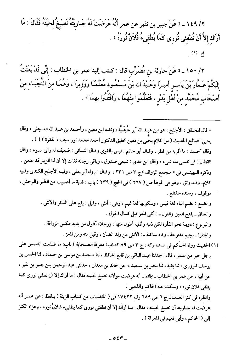2/ 149 - "عَنْ جبير بن نفير عن عمر أَنَّهُ عَرَضَتْ لَهُ جَارِيَتُهُ تَصْبِغُ لِحْيَتَهُ فَقَالَ: مَا أَرَاكِ إِلَّا أَنْ تُطْفِئِى نُورِى كَمَا يُطْفِئُ فُلَانٌ نُورَهُ".