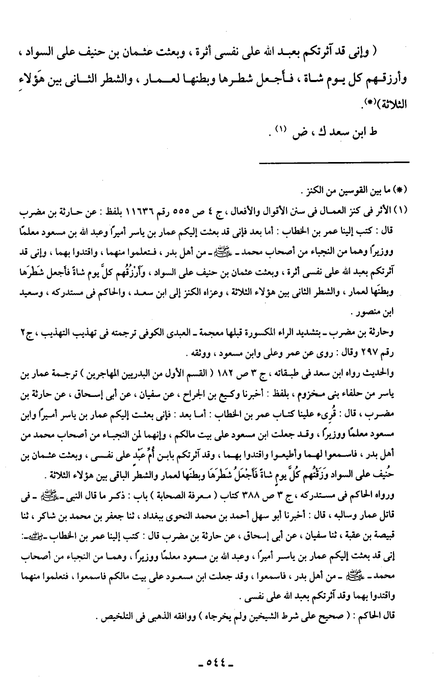 (¬1) الأثر في كنز العمال في سنن الأقوال والأفعال، ج 4 ص 555 رقم 11636 بلفظ: عن حارثة بن مضرب قال: كتب إلينا عمر بن الخطاب: أما بعد فإنى قد بعثت إليكم عمار بن ياسر أميرًا وعبد الله بن مسعود معلمًا ووزيرًا وهما من النجباء من أصحاب محمد - صلى الله عليه وسلم - من أهل بدر، فتعلموا منهما، واقتدوا بهما، وإنى قد آثرتكم بعد الله على نفسى أثرة، وبعثت عثمان بن حنيف على السواد، وَأَرْزُقُهم كلَّ يوم شاةً فأَجعل شَطرَها وبطنَها لعمار، والشطر الثانى بين هؤلاء الثلاثة، وعزاه الكنز إلى ابن سعد، والحاكم في مستدركه، وسعيد بن منصور.
