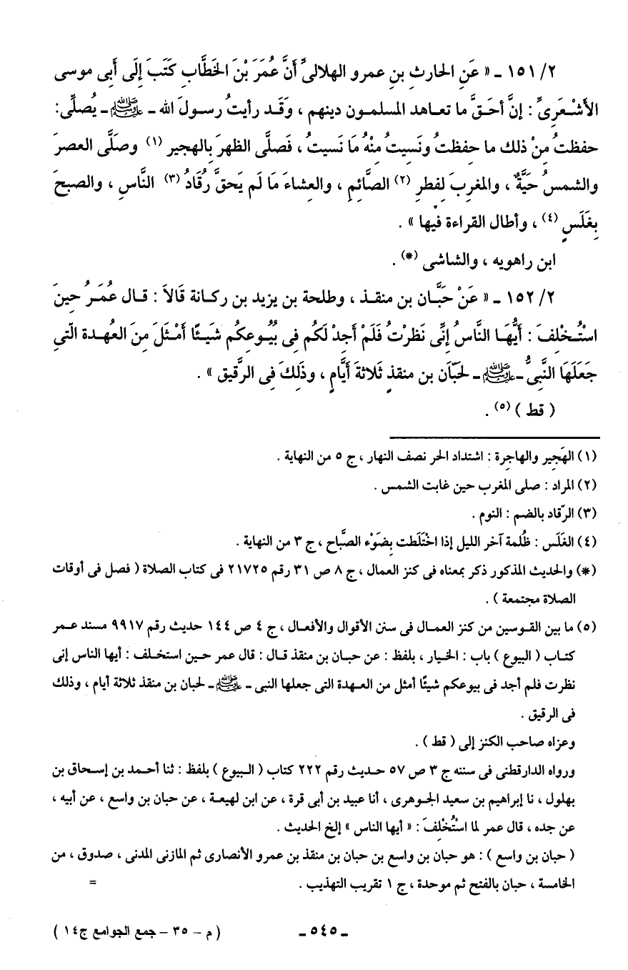 2/ 151 - "عَنِ الحارثِ بنِ عمرو الهلالىِّ أَنَّ عُمَرَ بْنَ الخَطَّابِ كتَبَ إِلَى أَبِى موسى الأَشْعَرِيِّ: إنَّ أحَقَّ ما تعاهد المسلمون دينهم، وَقَد رأيتُ رسولَ الله - صلى الله عليه وسلم - يُصلِّى: حفظتُ مِنْ ذلك ما حِفظتُ ونَسِيتُ مِنْهُ مَا نَسيتُ، فَصلَّى الظهرَ بِالهجير (¬1) وصَلَّى العصرَ والشمسُ حَيَّةٌ، والمغرِبَ لِفطرِ (¬2) الصَّائِمِ، والعِشاءَ مَا لَم يَحقَّ رُقَادُ (¬3) النَّاسِ، والصبحَ بِغَلَسٍ (¬4)، وأطال القراءة فيها".