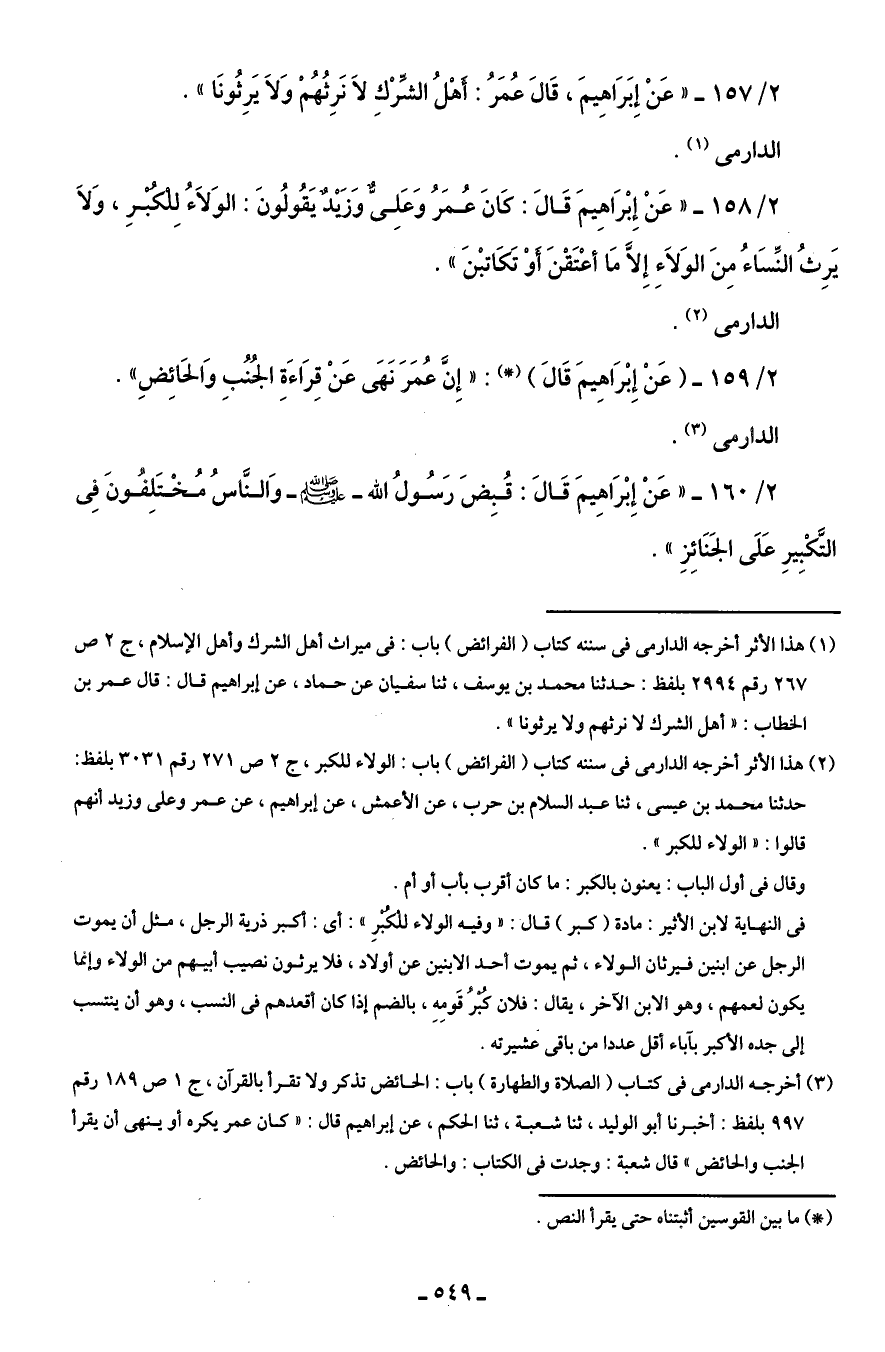 2/ 157 - "عَنْ إِبَرَاهِيمَ، قَالْ عُمَرُ: أَهْلُ الشِّرْكِ لَا نَرِثُهُمْ وَلَا يَرِثُونَا".