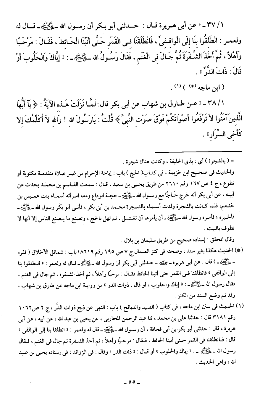 1/ 37 - "عن أَبى هريرة قال: حدثنى أبو بكر أن رسول الله - صلى الله عليه وسلم - قال له ولعمر: انْطَلِقُوا بِنَا إِلَى الْواقِفِىِّ، فَانْطَلَقْنَا فِى الْقَمَرِ حَتَّى أَتَيْنَا الْحَائِطَ، فَقَالَ: مَرْحَبًا وَأَهْلًا، ثُمَّ أَخَذَ الشَّفْرَةَ ثُمَّ جَالَ فِى الْغَنَمِ، فَقَالَ رَسُولُ الله - صلى الله عليه وسلم -: "إيَّاكَ وَالْحَلُوبَ أَوْ قَالَ: ذَاتَ الدَّرِّ".