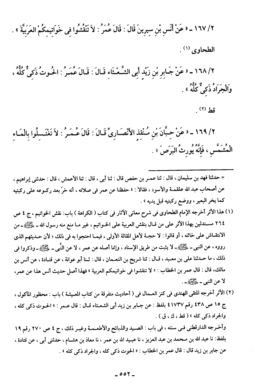 2/ 168 - "عَنْ جَابِرِ بْنِ زَيْدٍ أَبِى الشَّعْثَاءِ قَالَ: قَالَ عُمَرُ: الحُوتُ ذَكِىٌّ كُلُّهُ، وَالْجَرَادُ ذَكِىٌّ كُلُّهُ".