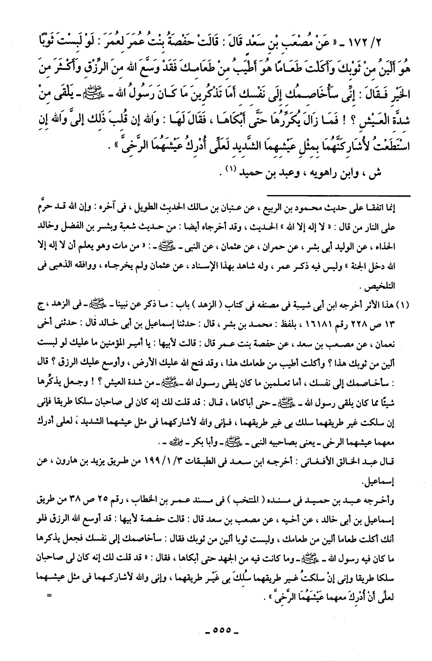 2/ 172 - "عَنْ مُصْعَبِ بْنِ سَعْد قَالَ: قَالَتْ حَفْصَةُ بِنْتُ عُمَرَ لِعُمَرَ: لَوْ لَبِسْتَ ثَوْبًا هُوَ أَلْيَنُ مِنْ ثَوْبِكَ وَأَكَلْتَ طَعَامًا هُوَ أَطْيَبُ مِنْ طَعَامِكَ فَقَدْ وَسَّعَ الله مِنَ الرِّزْقِ وَأَكْثَرَ مِنَ الخَيْرِ فَقَالَ: إِنِّى سَأُخَاصِمُكِ إِلَى نَفْسِكِ أمَا تَذْكُرِينَ مَا كَانَ رَسُولُ الله - صلى الله عليه وسلم - يَلْقَى مِنْ شِدَّةِ الْعَيْشِ؟ ! فَمَا زَالَ يُكَرَّرُهَا حَتَّى أَبْكَاهَا، فَقَالَ لَهَا: وَالله إن قُلِبَ ذَلِك إلىَّ وَالله إِنِ اسْتَطَعْتُ لأُشَارِكَنَّهُمَا بِمِثْلِ عَيْشِهِمَا الشَّدِيدِ لَعَلِّى أُدْرِكُ عَيْشَهُمَا الرَّخِىَّ".