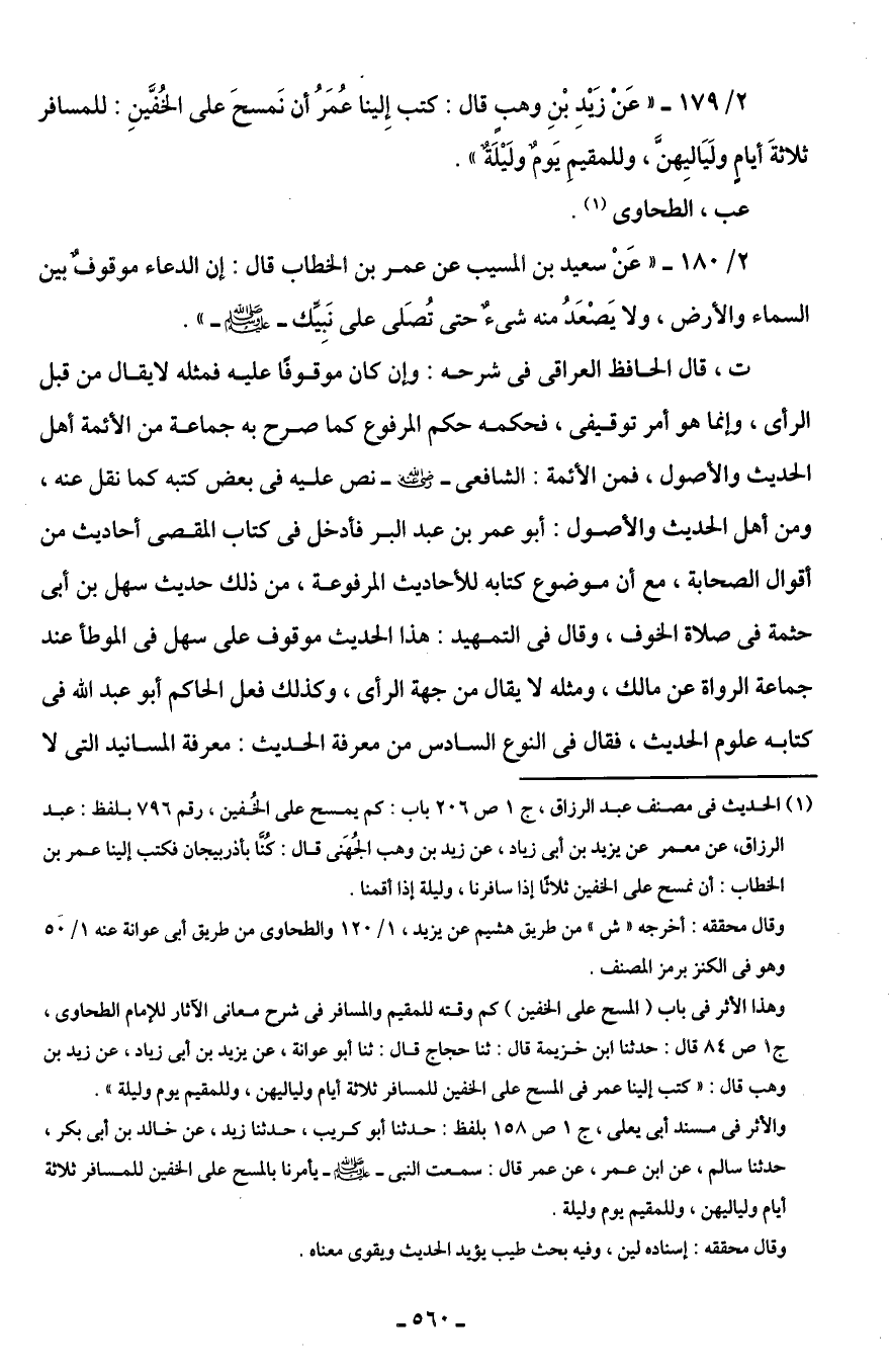 2/ 179 - "عَنْ زَيْدِ بْنِ وهبٍ قال: كتب إِلينا عُمَرُ أن نَمسحَ على الخُفَّينِ: للمسافر ثلاثةَ أيامٍ ولَيَاليِهنَّ، وللمقيمِ يَومٌ ولَيْلَةٌ".