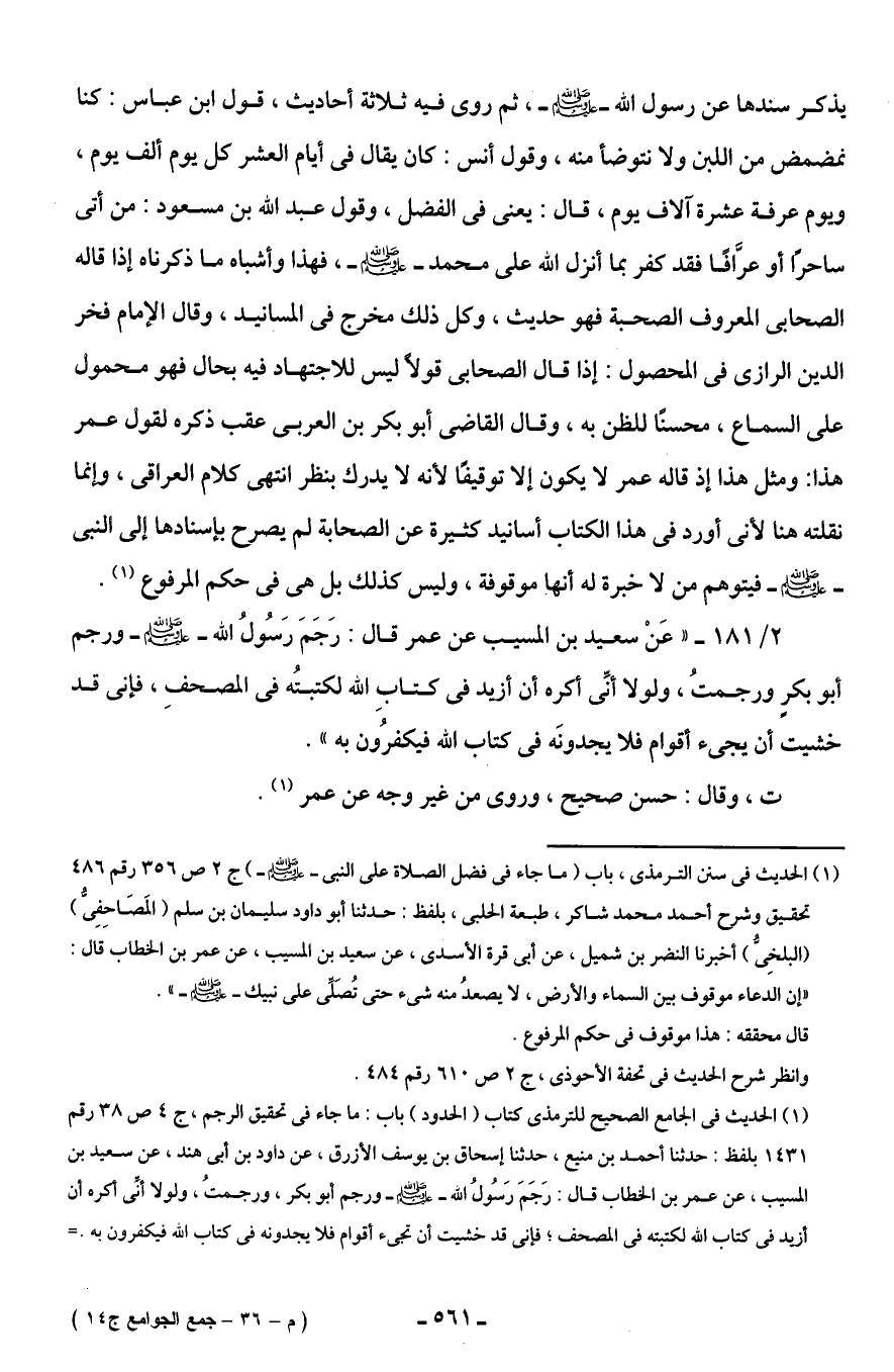 2/ 181 - "عَنْ سعيد بن المسيب عن عمر قال: رَجَمَ رَسُولُ الله - صلى الله عليه وسلم - ورجم أبو بكرٍ ورجمتُ، ولولا أنِّى أكره أن أزيد في كتابِ الله لكتبتُه في المصحفِ، فإنى قد خشيت أن يجئ أقوام فلا يجدونَه في كتاب الله فيكفرُون به".