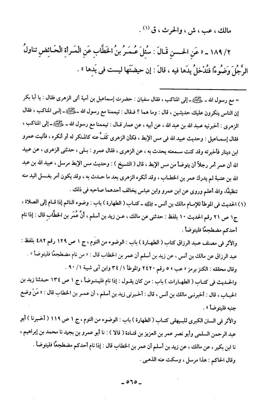 وقال محققه: الكنز برمز "عب" 5 رقم 2420 والموطأ 1/ 34 وابن أبى شيبة 1/ 90.